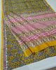To maintain the beauty of the hand block prints and the delicate fabric, it is recommended to dry clean the saree. Avoid using harsh detergents or machine washing to preserve the colors and texture.