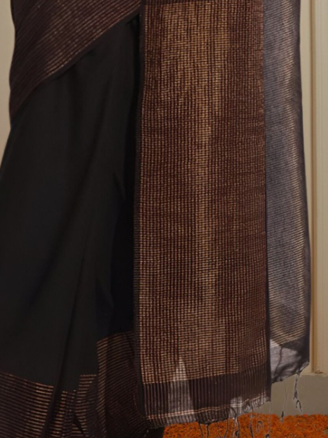 Skilled artisans weave the saree using **handlooms**, where **pure linen yarns** are combined with **zari threads** to create delicate patterns. Each saree may take several days to complete, involving precision, rhythm, and craftsmanship passed down through generations.