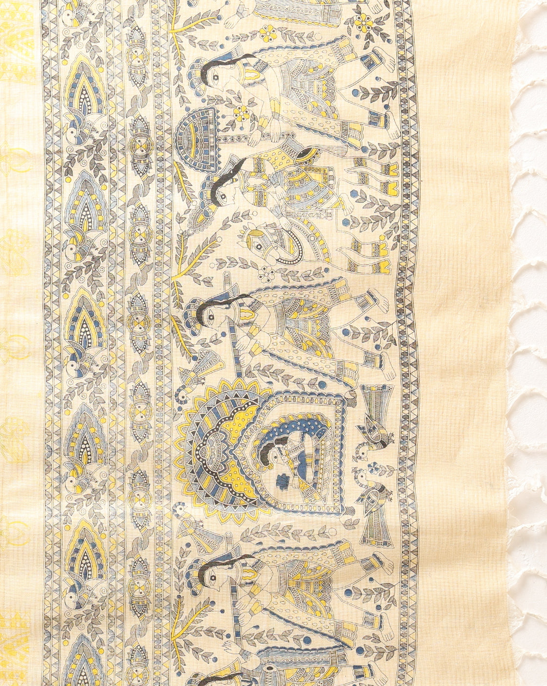 Madhubani handblock print combines the intricate motifs of Madhubani art with the traditional block printing technique. Artisans carve wooden blocks with Madhubani-inspired designs, which are then used to print patterns onto fabric. This process results in vibrant and detailed textiles, often depicting scenes from nature, mythology, or everyday life, with a unique cultural charm.