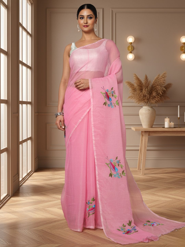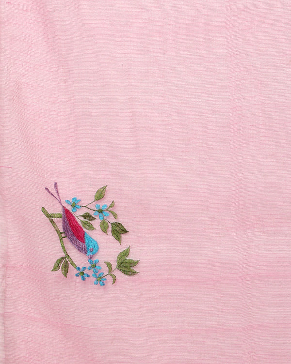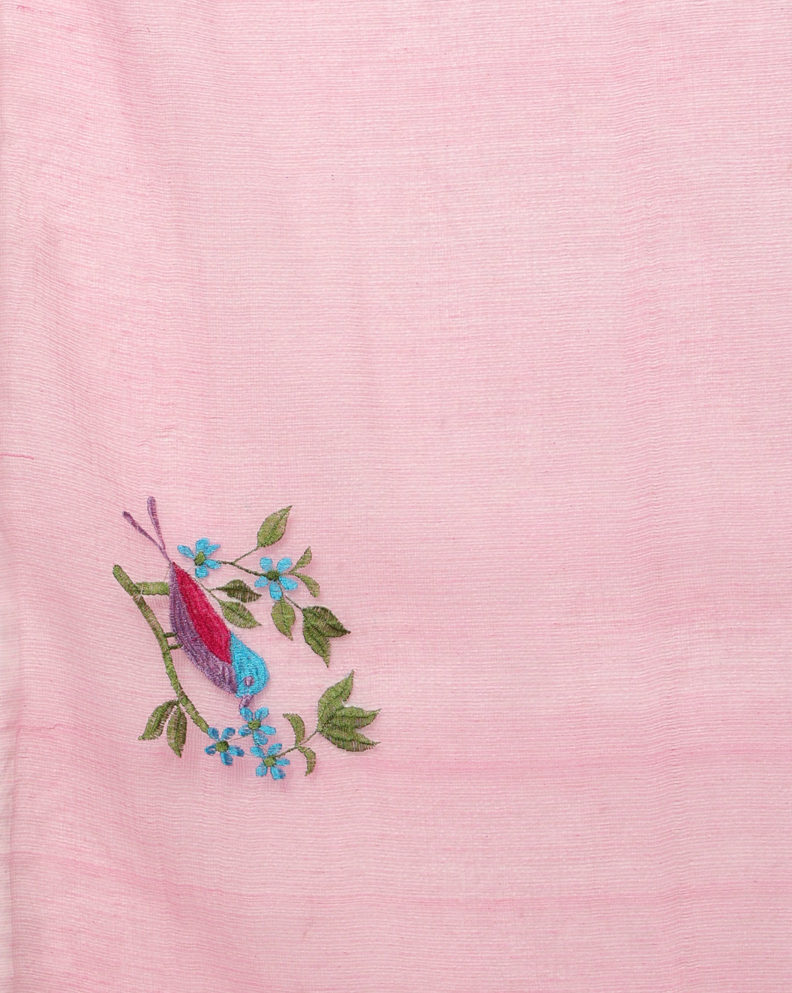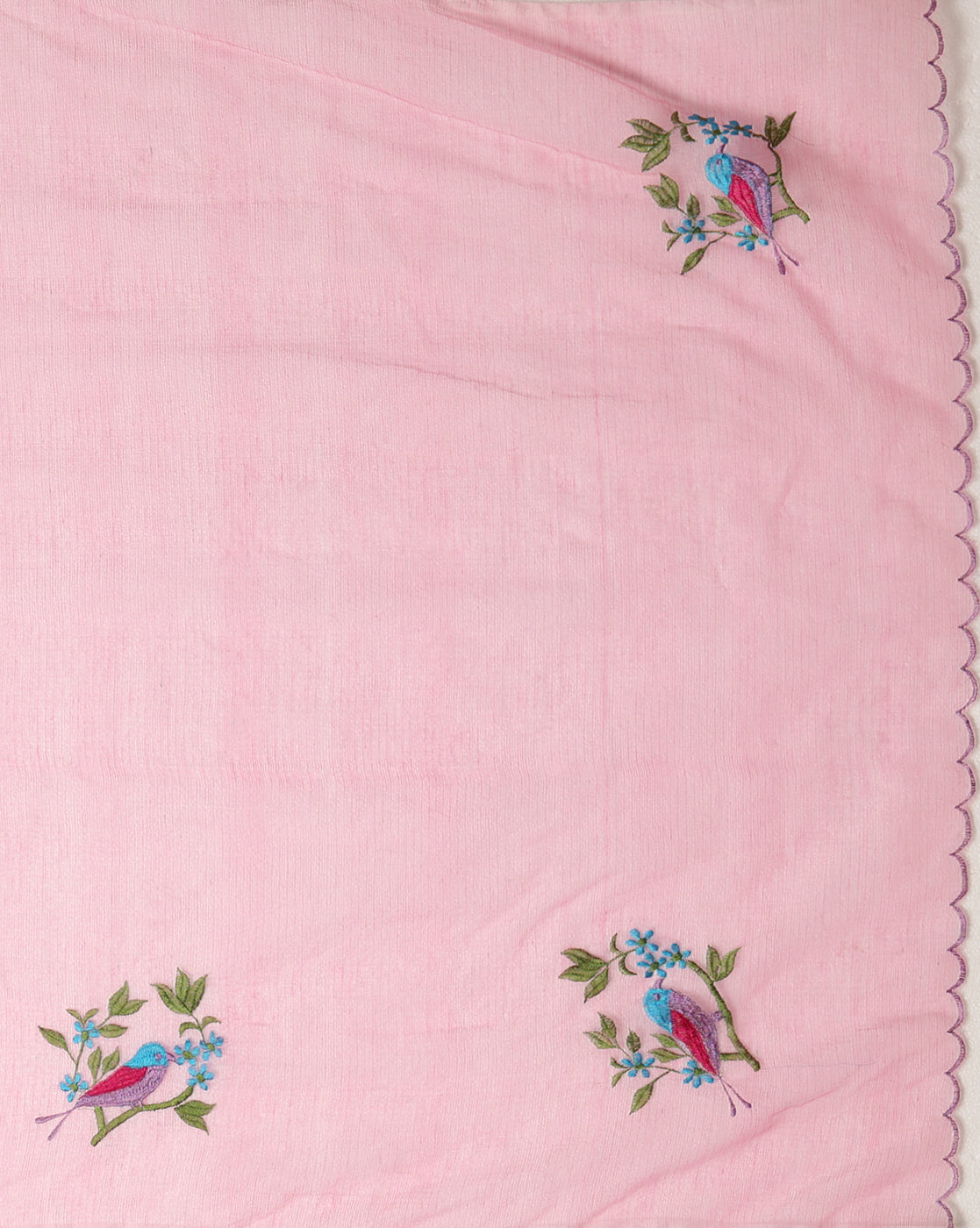 Bold Kota Doria Cotton Bird Embroidery Pink Saree Handdyed