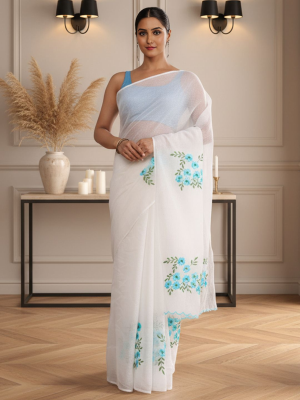 Classic Kota Doria White Pure Cotton Floral Embroidery Saree