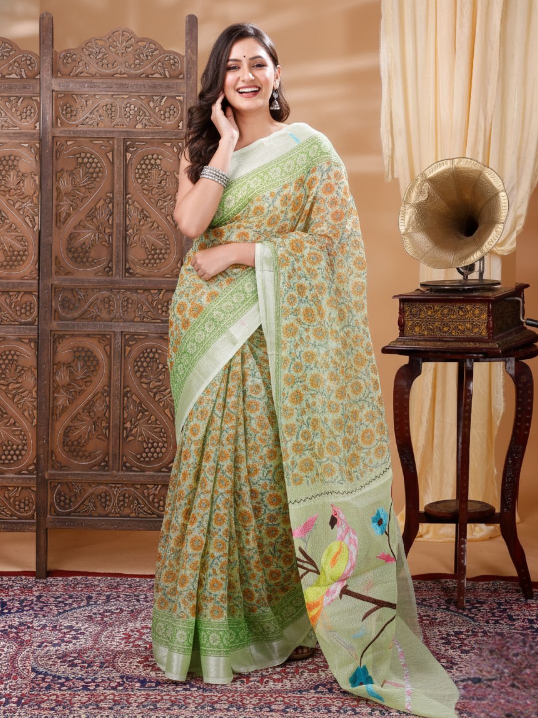 A Kota Doria Paithani Embroidery Designer Saree is a traditional Indian saree crafted from Kota Doria fabric featuring intricate Paithani-style embroidery. Paithani embroidery is known for its rich motifs and designs inspired by Maharashtra's Paithani sarees. The saree comes with a matching blouse.