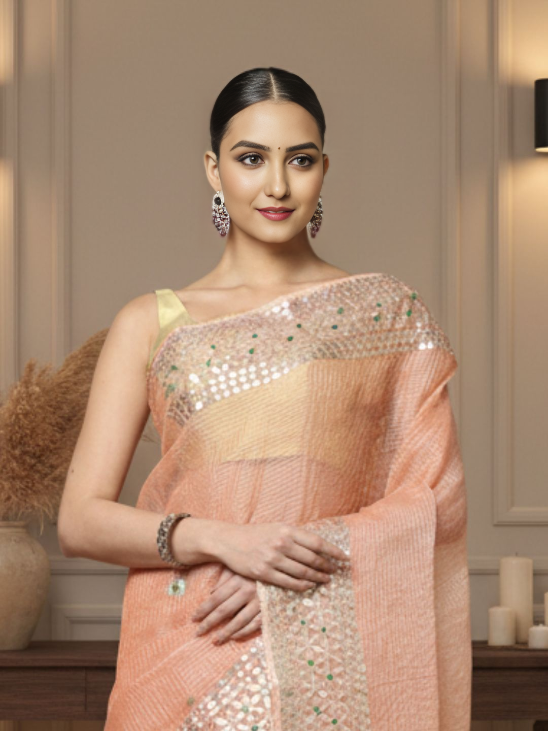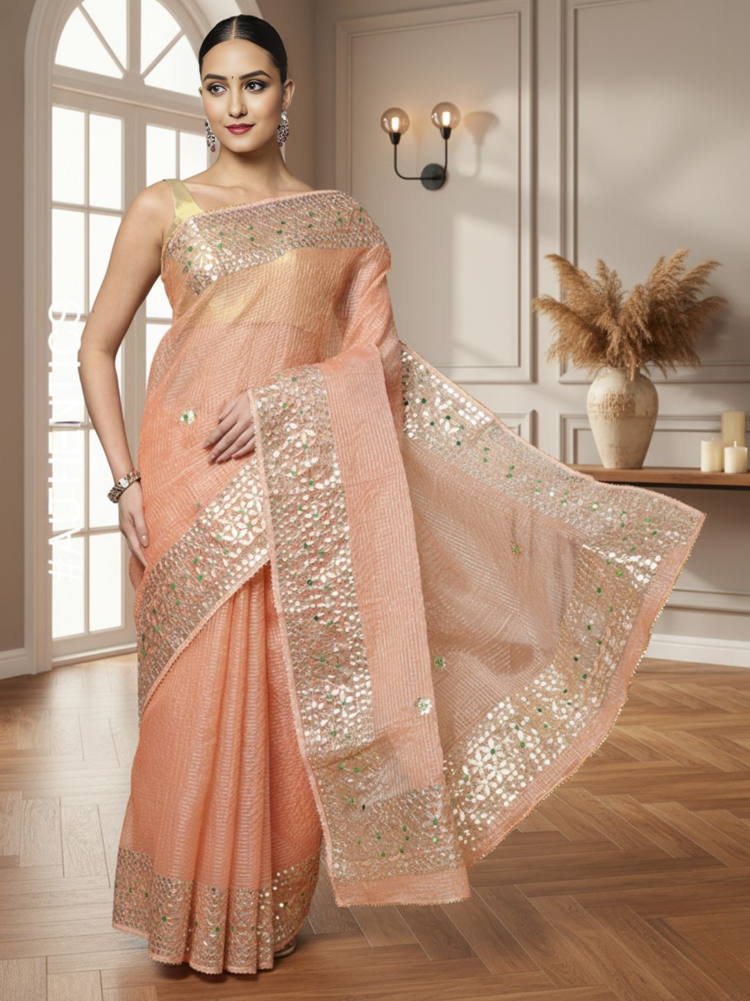 - Embroidery: Skilled artisans embellish the saree with handcrafted Gota Patti work, adding intricate floral and paisley motifs.