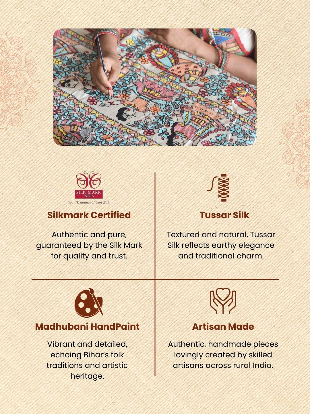 Make a style statement with our Handcrafted Silkmark Tussar Madhubani Suit. Featuring traditional Madhubani paintings on Tussar silk fabric, each suit exudes elegance and charm, perfect for weddings, festivals, and special occasions, adding a touch of cultural flair to your look.