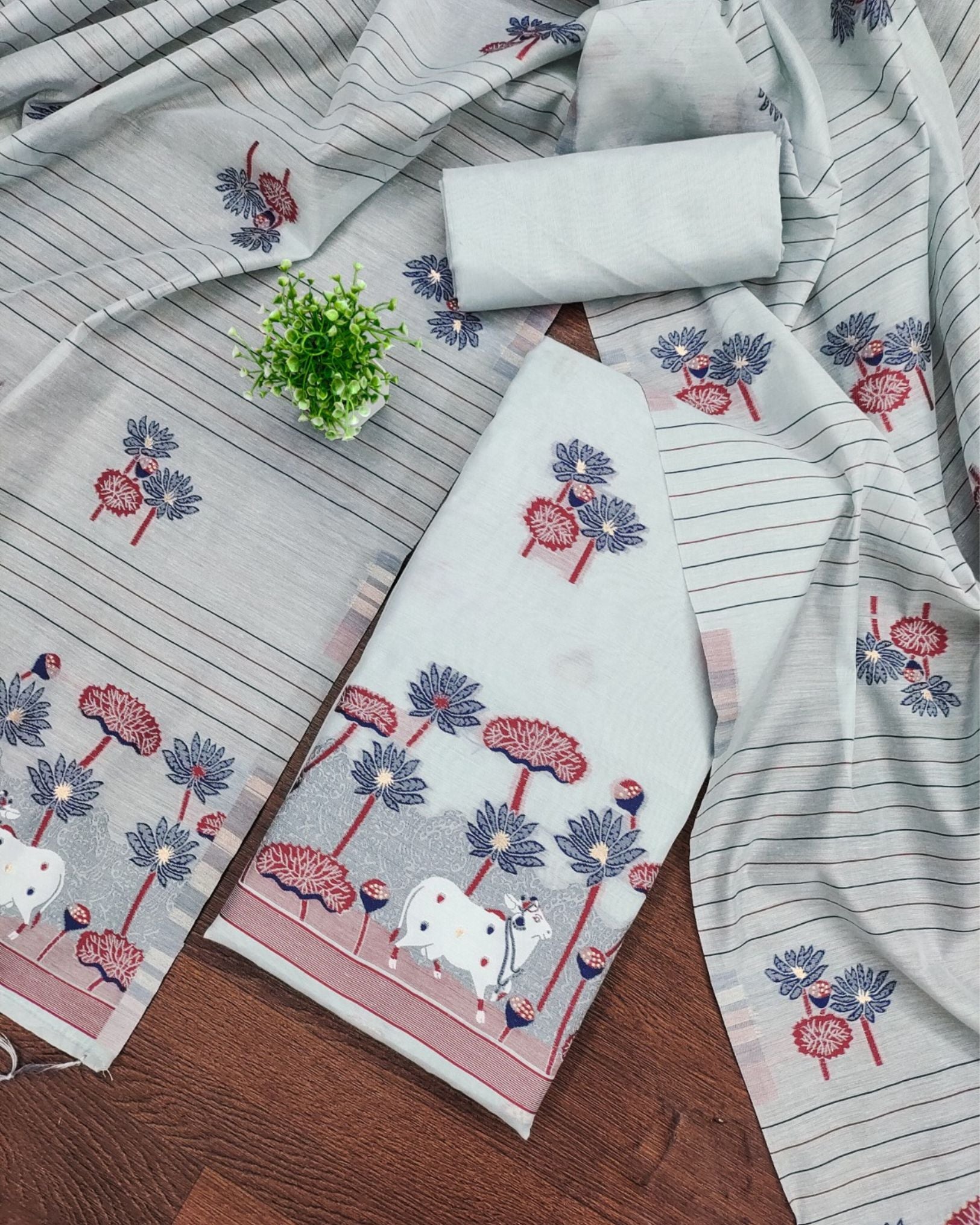 The suit is made by skilled weavers using traditional handlooms in Banaras. Artisans interlace cotton threads with brocade (zari) threads to form detailed patterns like floral vines, paisleys, or traditional motifs. The process is slow and intricate, requiring precision and artistry.