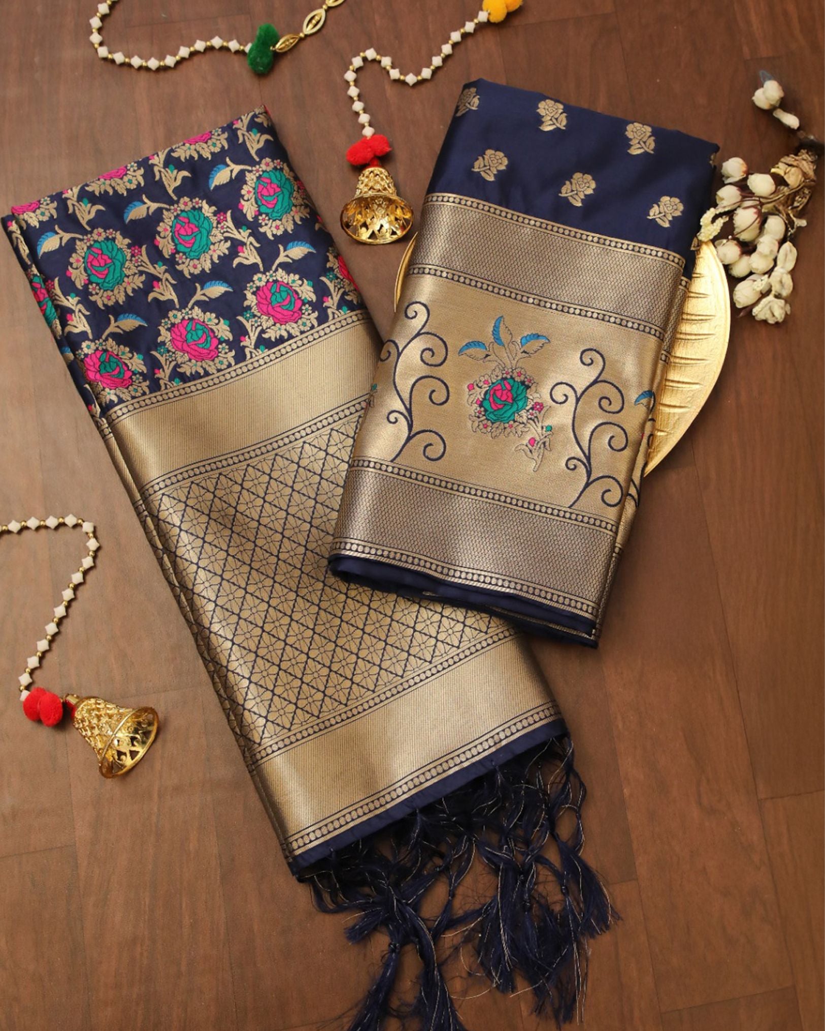 Noor-e-Banaras Brocade Weaving Lichi Silk Suit Navy Blue