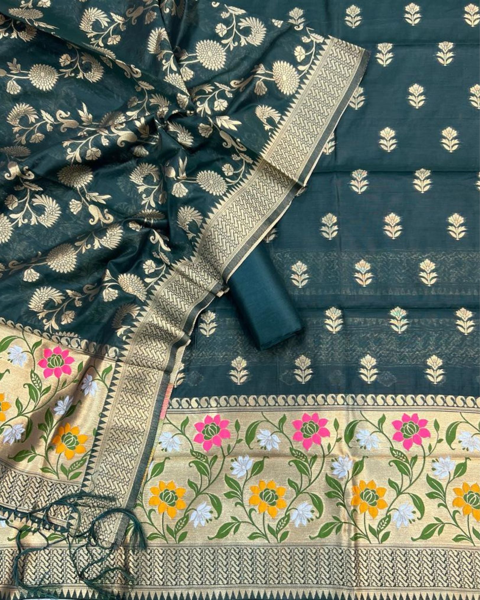 Elevate your ethnic wardrobe with our Banarasi Cotton Suit featuring exquisite brocade weaving, blending timeless tradition with contemporary elegance. Perfect for festive occasions, celebrations, and graceful everyday wear.