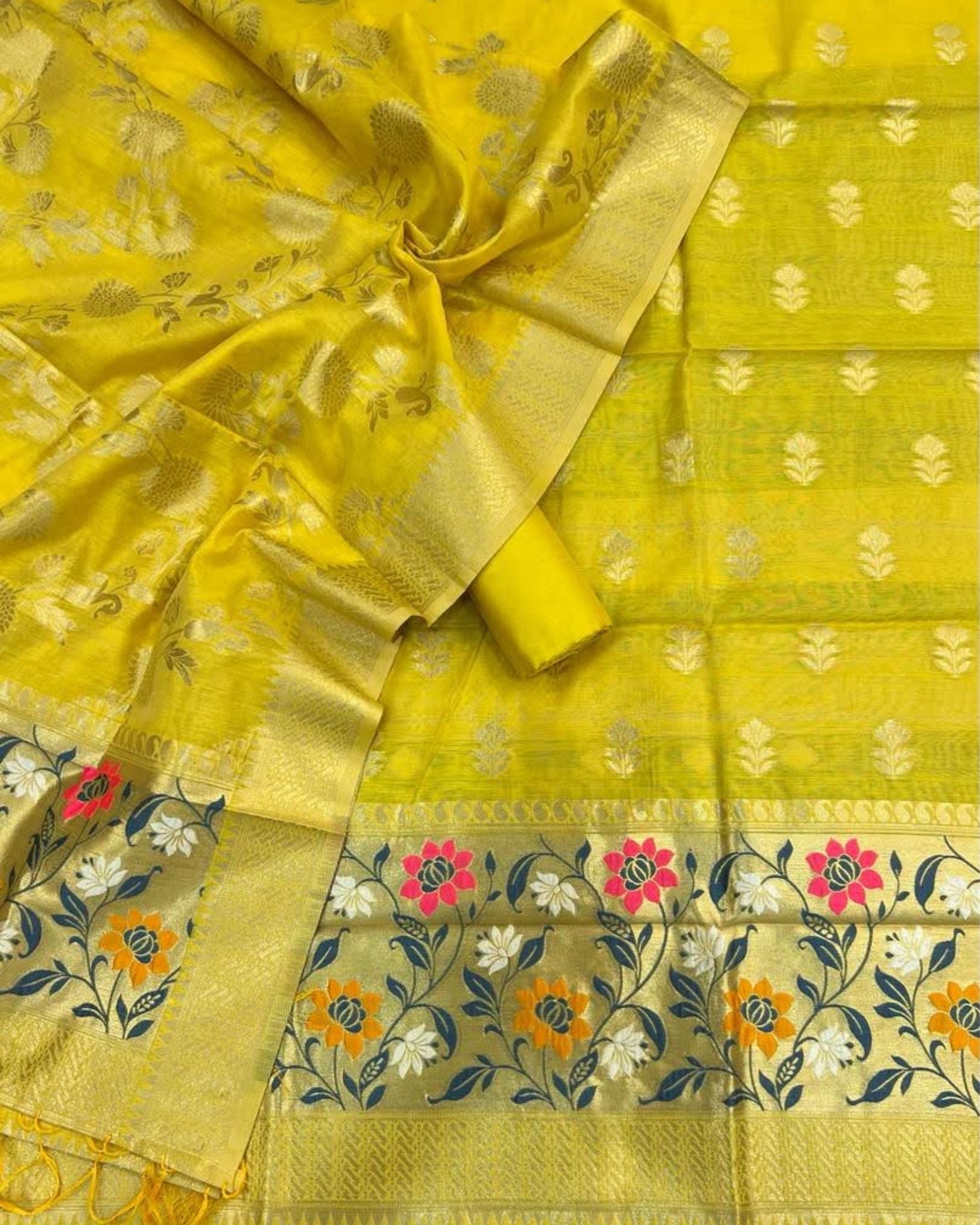 The suit is made by skilled weavers using traditional handlooms in Banaras. Artisans interlace cotton threads with brocade (zari) threads to form detailed patterns like floral vines, paisleys, or traditional motifs. The process is slow and intricate, requiring precision and artistry.
