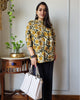 A Pure Cotton Peplum Top Hand Block Print is a garment made from 100% cotton, featuring a peplum style (flared at the waist) and adorned with hand block prints, a traditional printing technique using carved blocks to apply patterns onto fabric.
