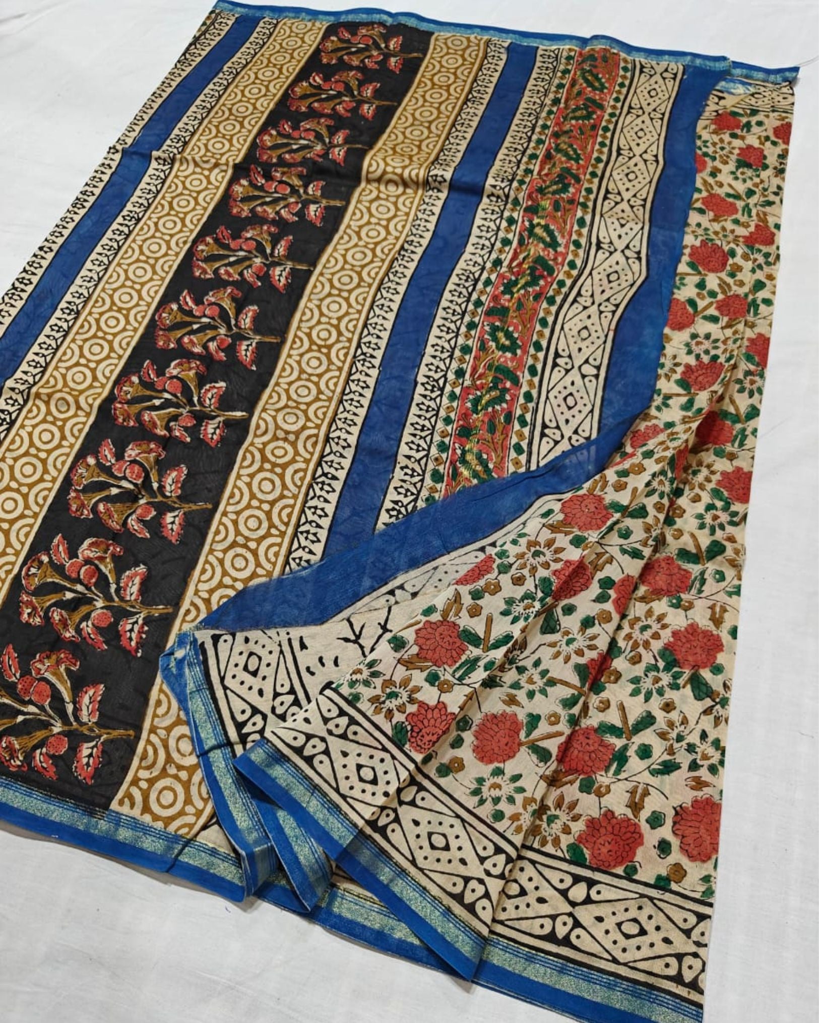 This saree is made by skilled artisans who first weave the lightweight Chanderi silk and then carefully apply Kalamkari block prints using hand-carved wooden blocks. The fabric is then treated with natural dyes, making the entire process eco-friendly and artful.