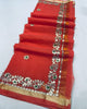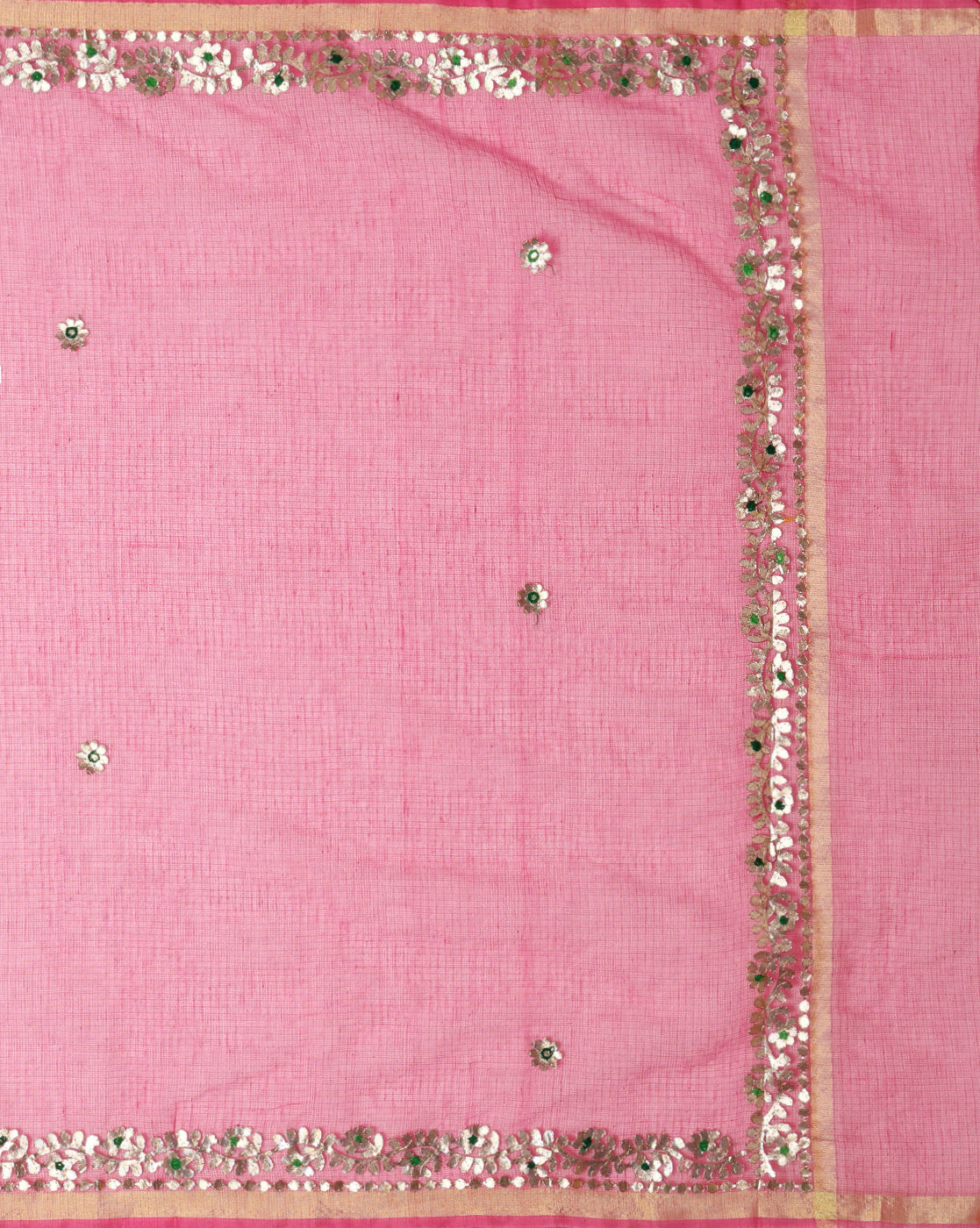 - The saree is made from high-quality Kota cotton, which is woven on traditional handlooms to achieve its characteristic lightweight and slightly stiff texture. The Gota Patti embellishments are meticulously handcrafted by skilled artisans who cut, shape, and stitch the metallic ribbons onto the fabric, creating intricate designs.