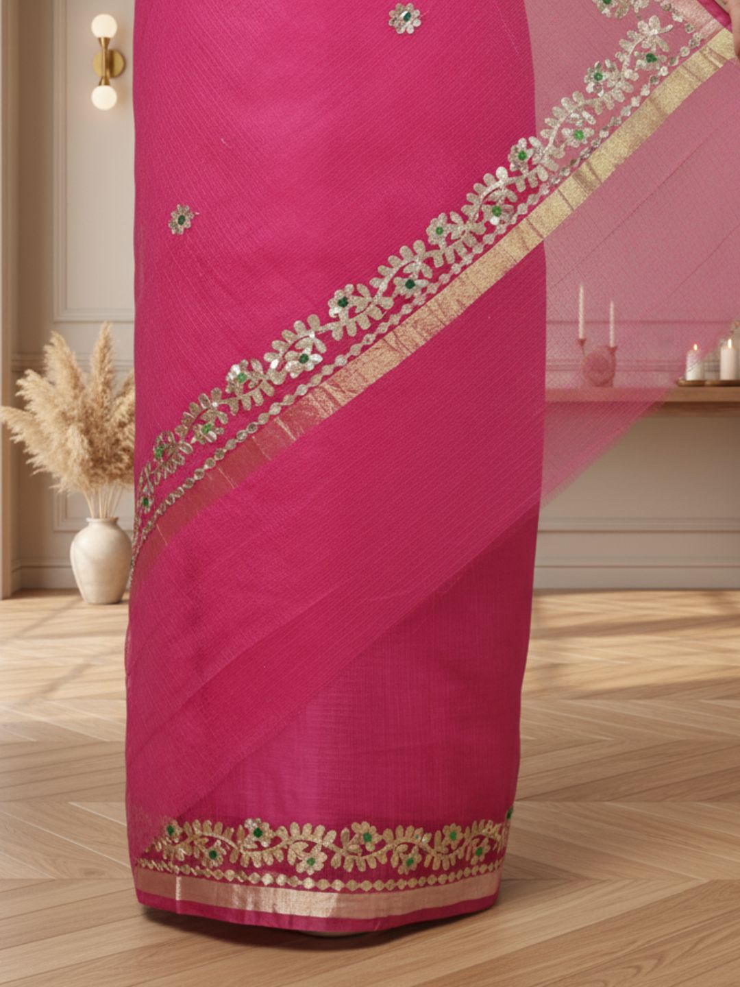 - The saree is made from high-quality Kota cotton, which is woven on traditional handlooms to achieve its characteristic lightweight and slightly stiff texture. The Gota Patti embellishments are meticulously handcrafted by skilled artisans who cut, shape, and stitch the metallic ribbons onto the fabric, creating intricate designs.
