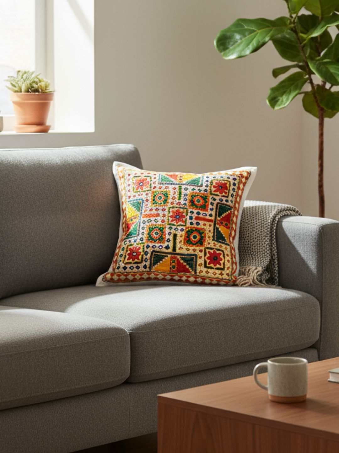 Hand Embroidered Cotton Multicolor Mirror Cushion Cover, showcasing vibrant artistry with intricate mirror work. Crafted from premium cotton, it adds charm, tradition, and elegance to your living space. Perfect for décor and gifting.