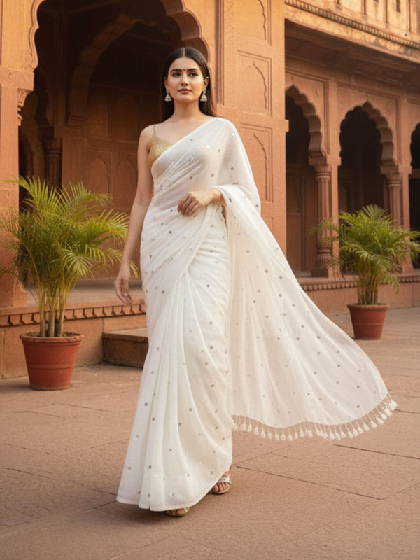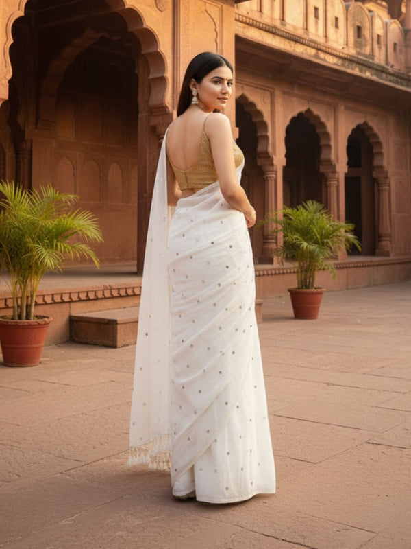 Gini Baani Pure Mul Cotton Sequin White Saree