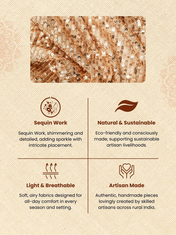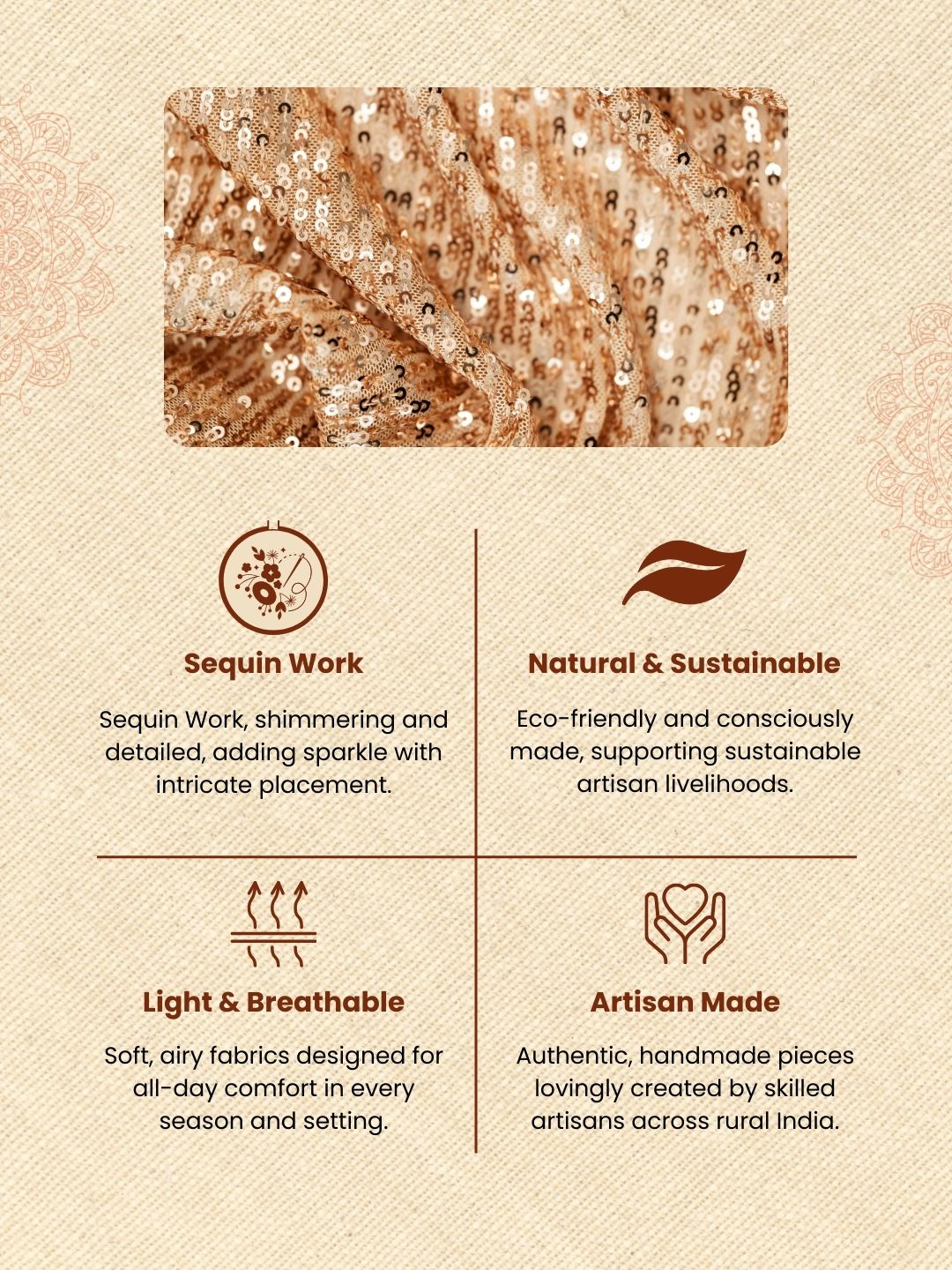 **Sequin Work** is a decorative technique where small, shiny discs called sequins are stitched onto fabric to create sparkle and texture. Applied by hand or machine, this work enhances sarees, lehengas, dupattas, and gowns with a bright, festive, and eye-catching finish suitable for celebrations and special occasions.
