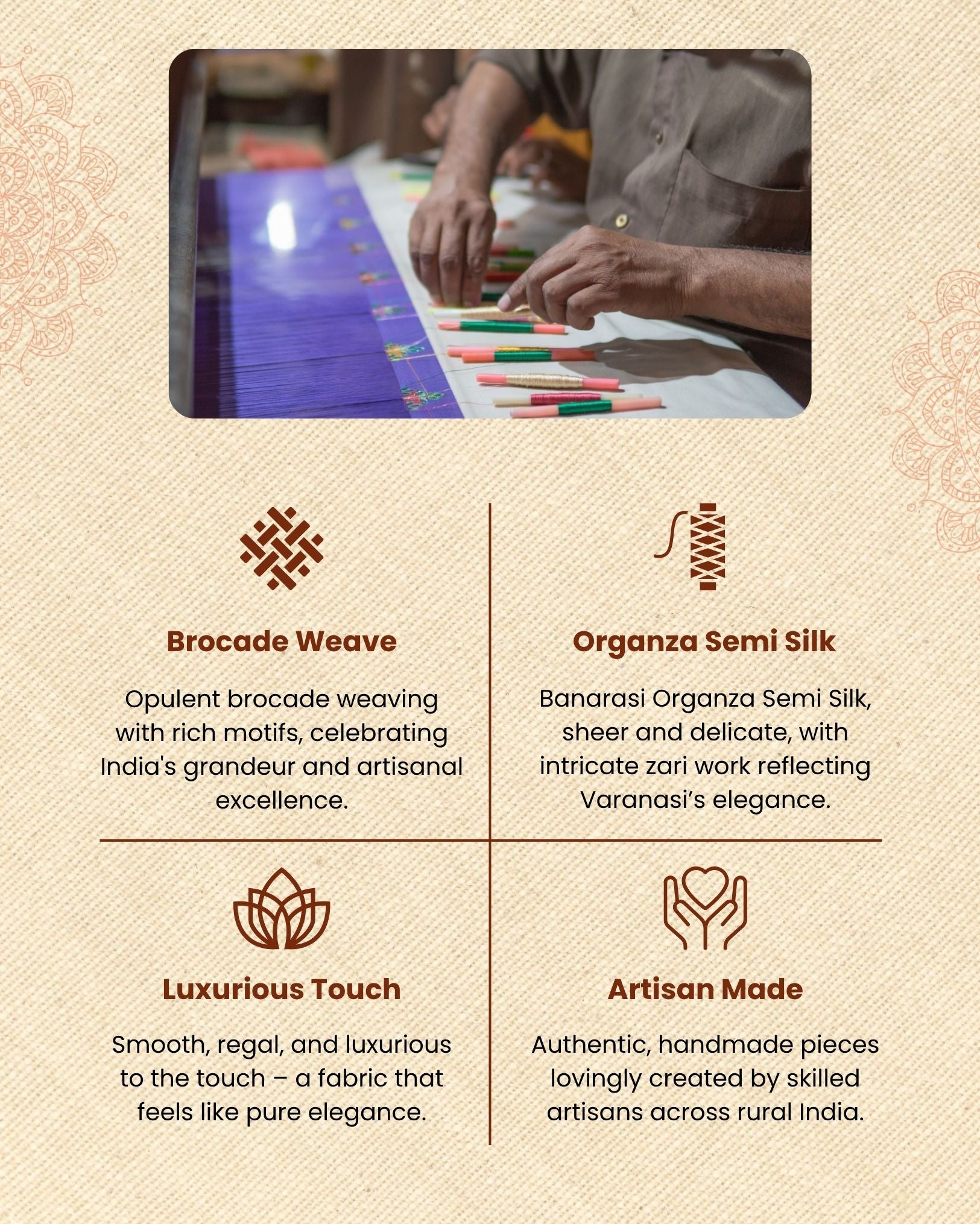 This saree is woven on handlooms by skilled artisans. The weaving involves laying out organza warp threads and carefully introducing weft threads with zari motifs. The brocade work is done meticulously, often taking several days to weeks to complete one saree.