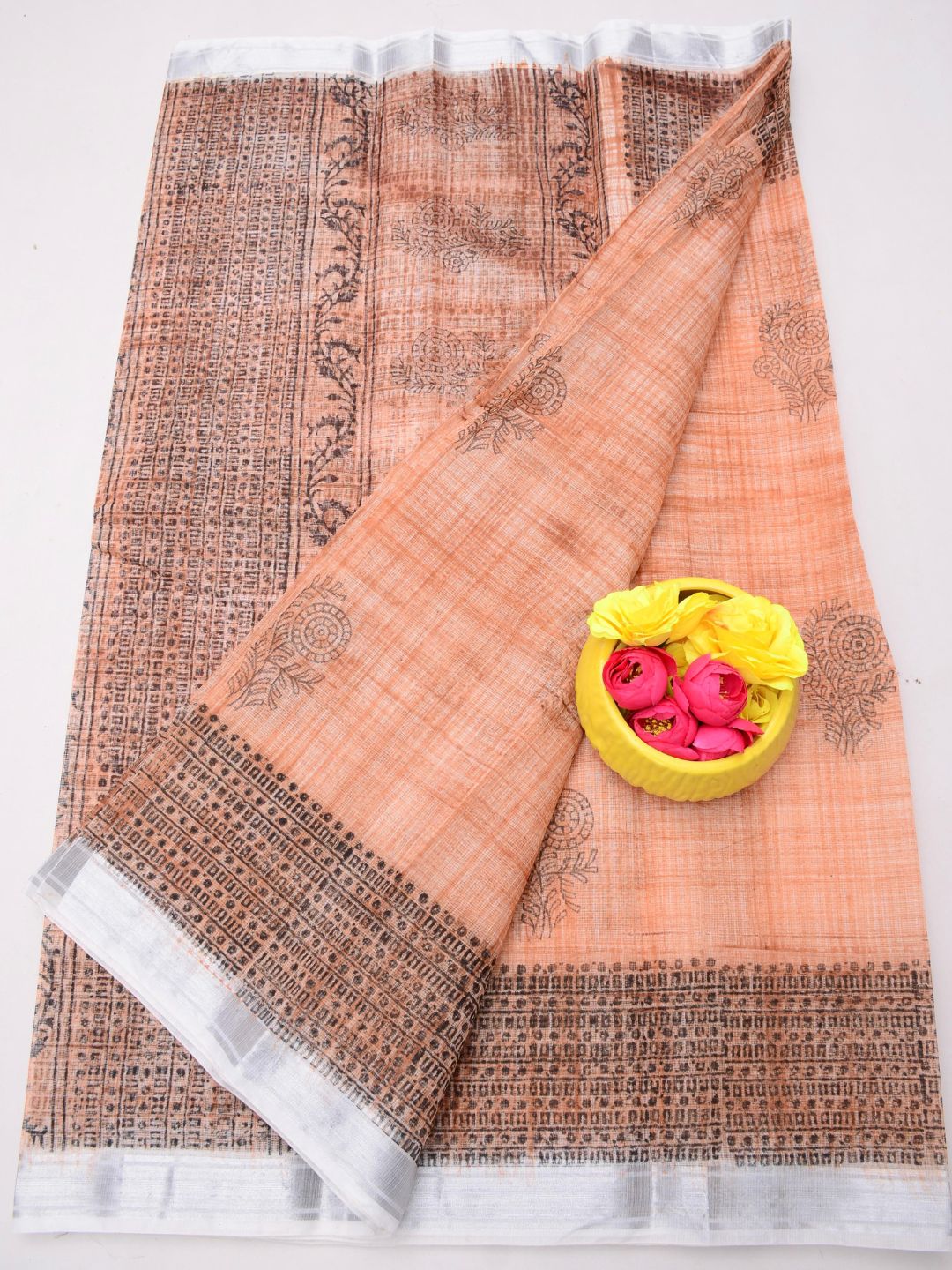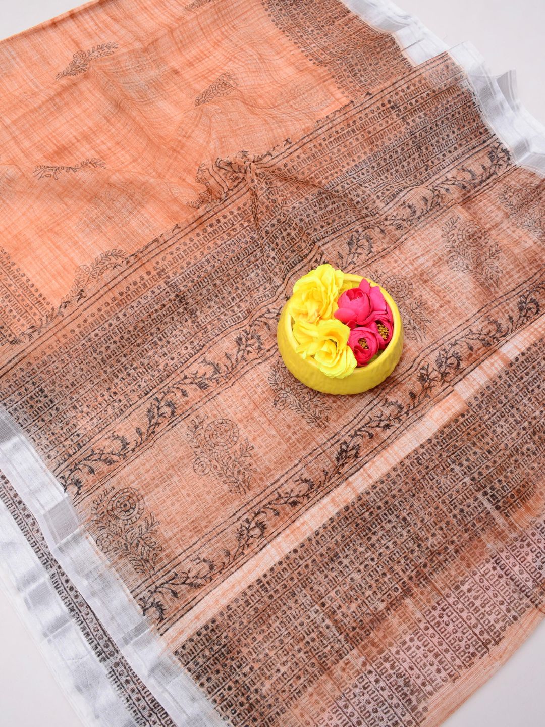 Varnika Warm Peach Blockprint Kota Doria Saree