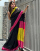 A Handwoven Pure Linen Saree with a Plain Body and Striped Pallu features a saree crafted from linen fabric with a simple, plain body and a decorative pallu adorned with colorful stripes. This design creates an elegant contrast.