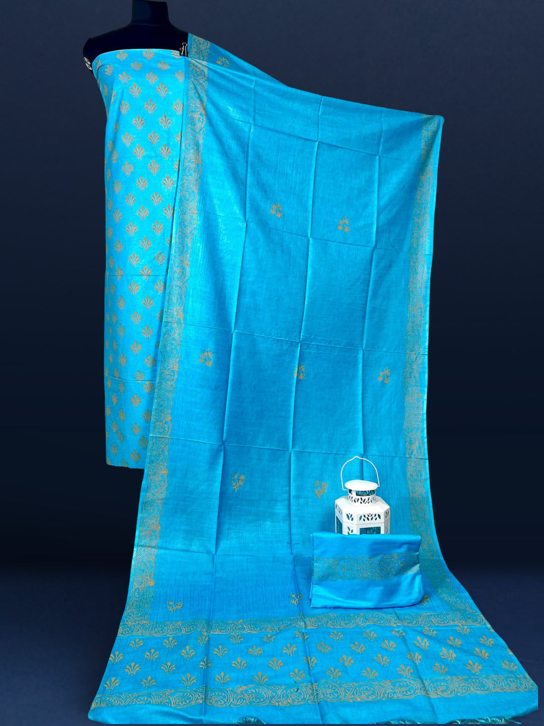 A Suit Piece with Bottom and Dupatta refers to a set of fabric pieces used to create a traditional Indian suit ensemble. It includes a fabric for the suit's top (kameez), bottom (salwar or pants), and a matching or contrasting dupatta (scarf).