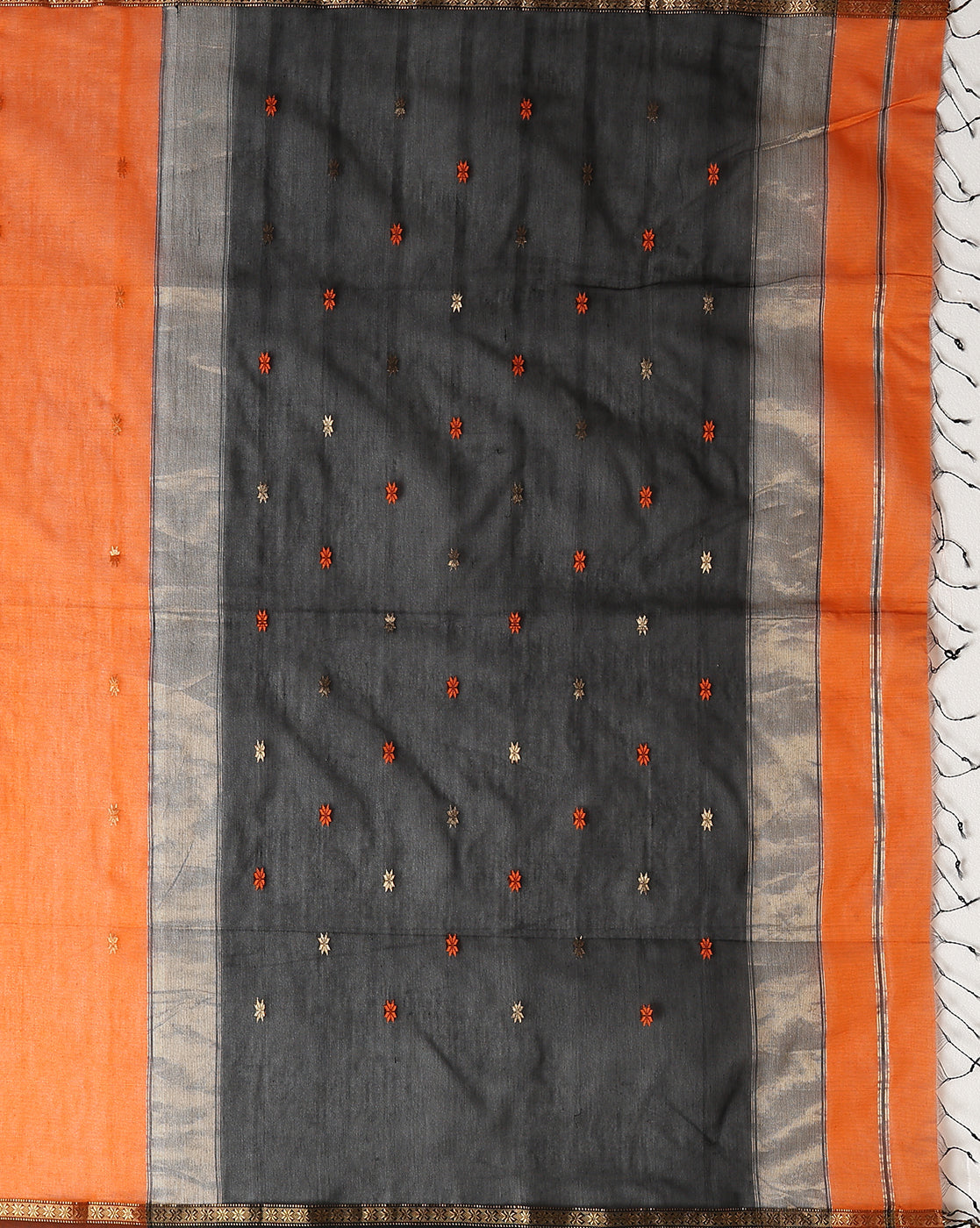 The Butta Body refers to the elaborate floral or paisley motifs intricately woven into the main fabric of the saree. These butta designs add richness and texture to the saree's overall appearance.