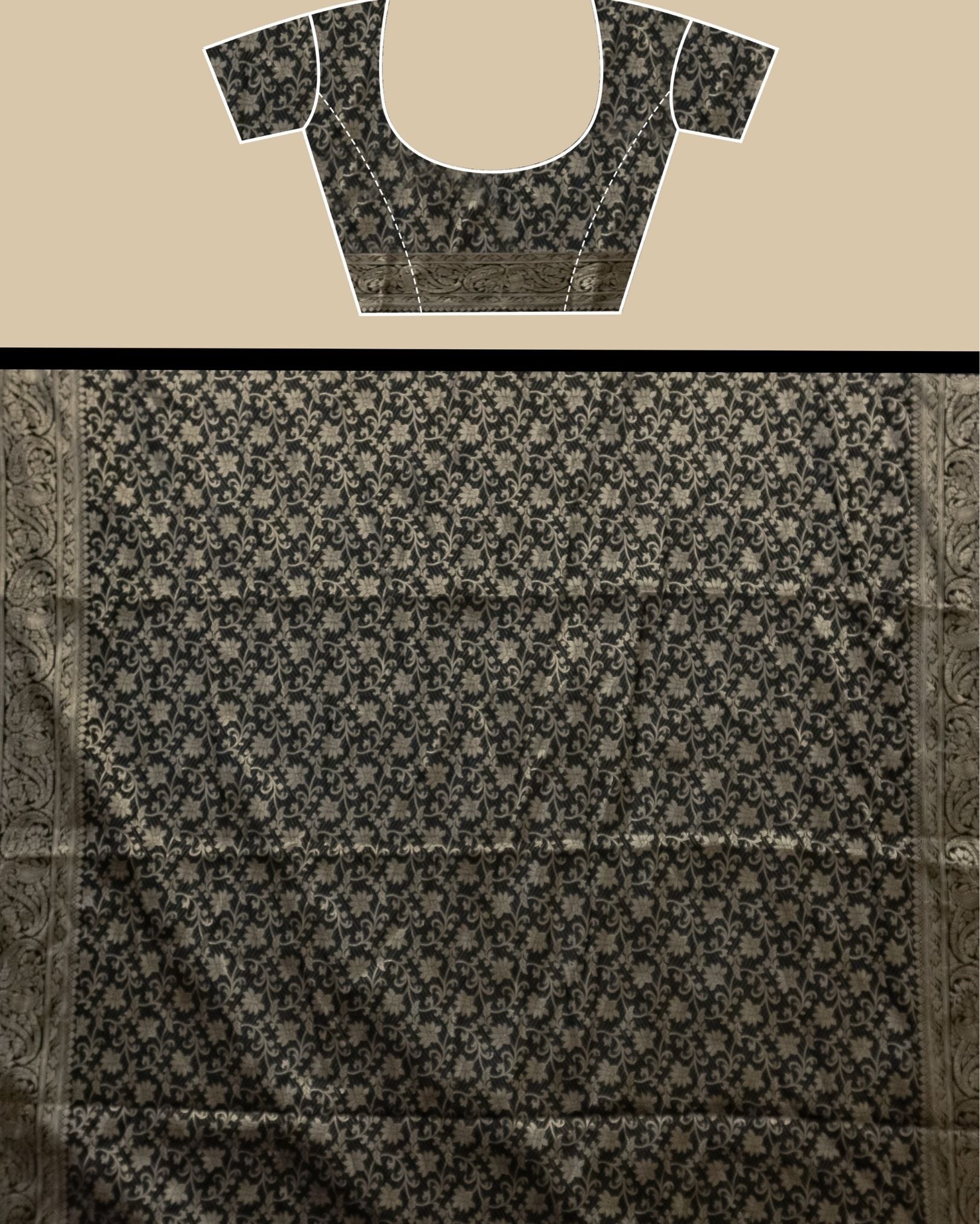 Buta weaving refers to the process of creating small, decorative motifs (often floral or paisley) using zari (metallic threads) or silk threads during the weaving of the fabric. These butas are spaced evenly or in specific layouts, giving the saree a timeless appeal.