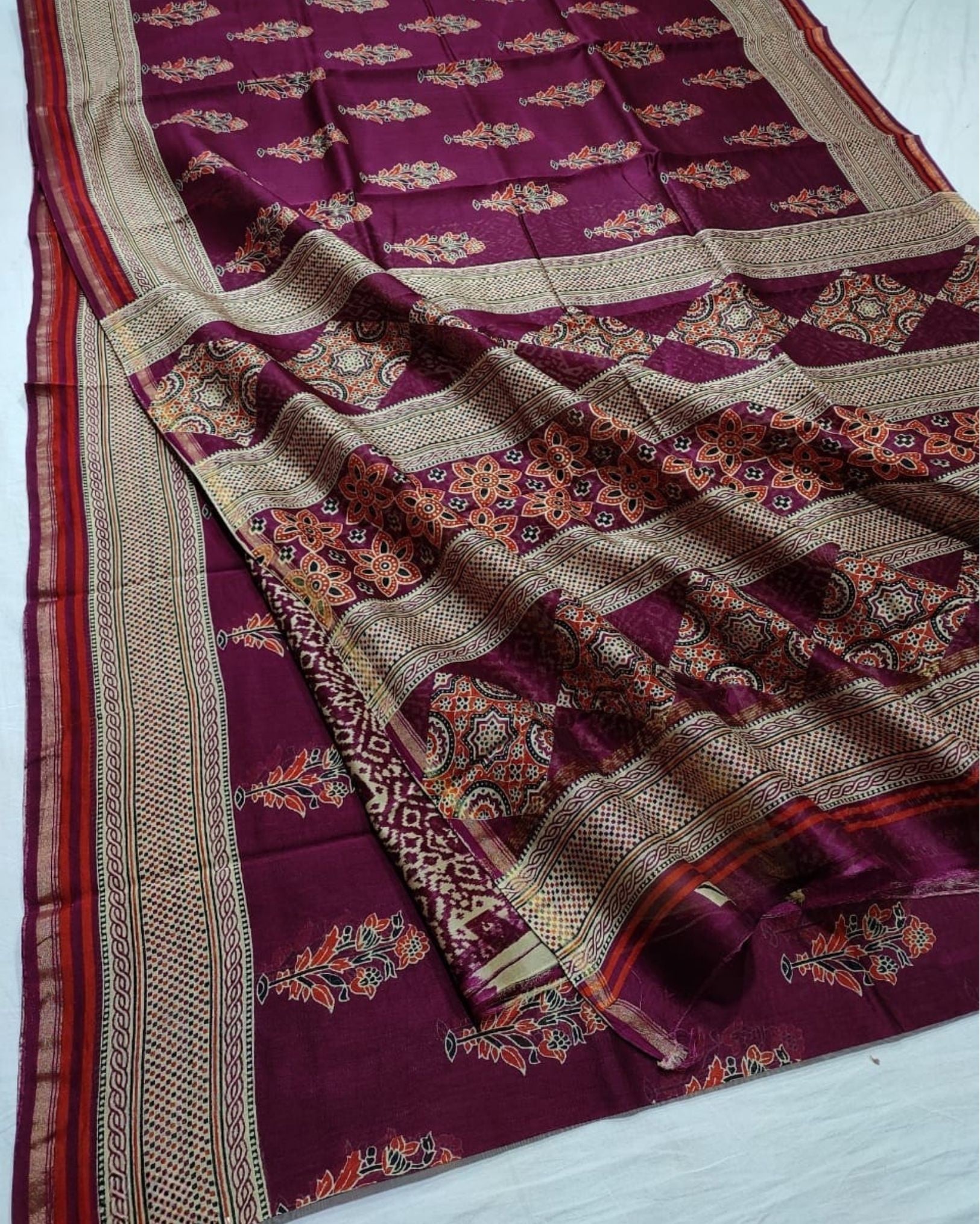 Elegant Chanderi Silk Saree featuring traditional Ajrakh Printing. Lightweight, breathable, and perfect for festive occasions or cultural events. A timeless blend of heritage craftsmanship and contemporary charm for your wardrobe.