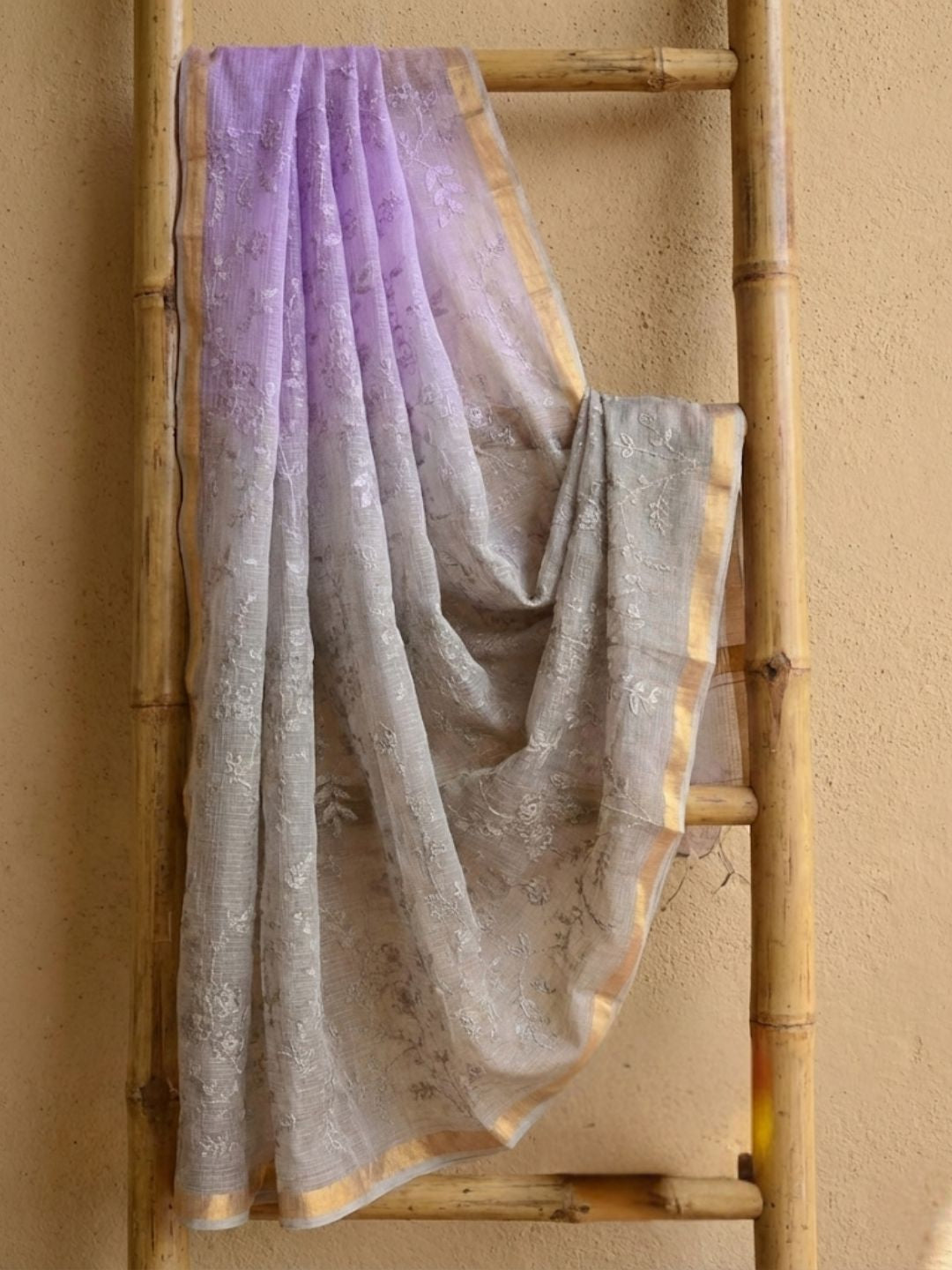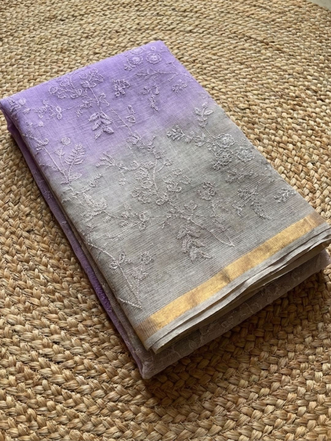 This saree is produced in Kota, Rajasthan, and involves a detailed process where cotton threads are woven into a delicate, translucent fabric. The intricate embroidery work is then carefully added, showcasing the expertise and creativity of the artisans.
