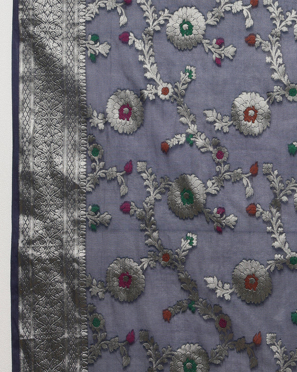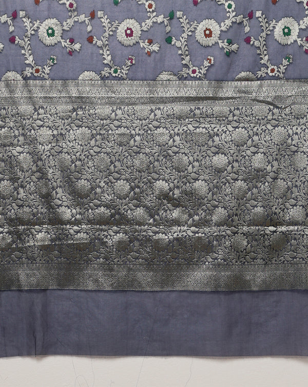The Katan Banarasi Silk Saree is characterized by its luxurious silk fabric, intricate zari work, and elaborate motifs such as floral, paisley, or geometric designs. The saree's pallu and borders are often adorned with traditional Banarasi patterns.