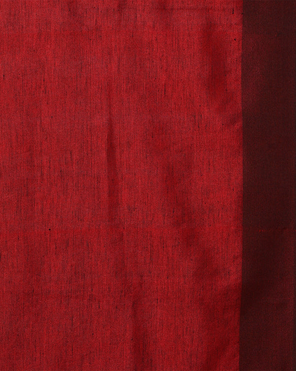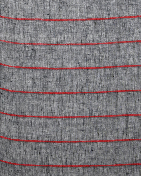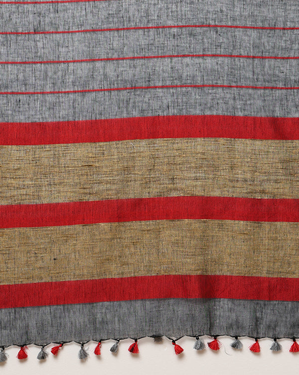 The Pure Linen Saree with Striped Design is woven on a loom by skilled artisans who use different colored threads to create the striped patterns. This weaving process results in visually appealing stripes across the length of the saree.