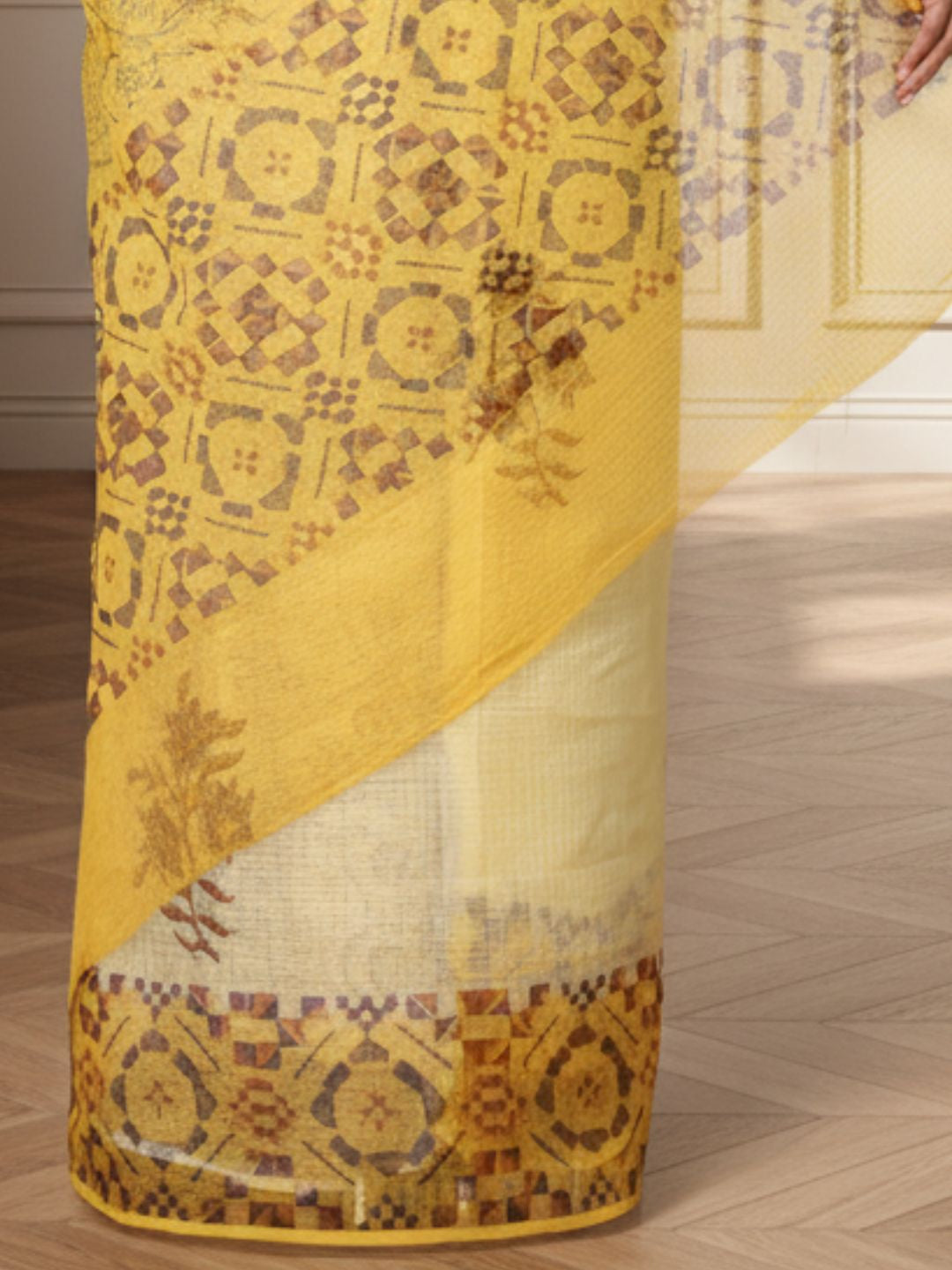 The Kota Doria Handblock Printed Saree set includes the saree and an unstitched blouse piece. The blouse fabric matches the saree's design and can be tailored according to the wearer's measurements.