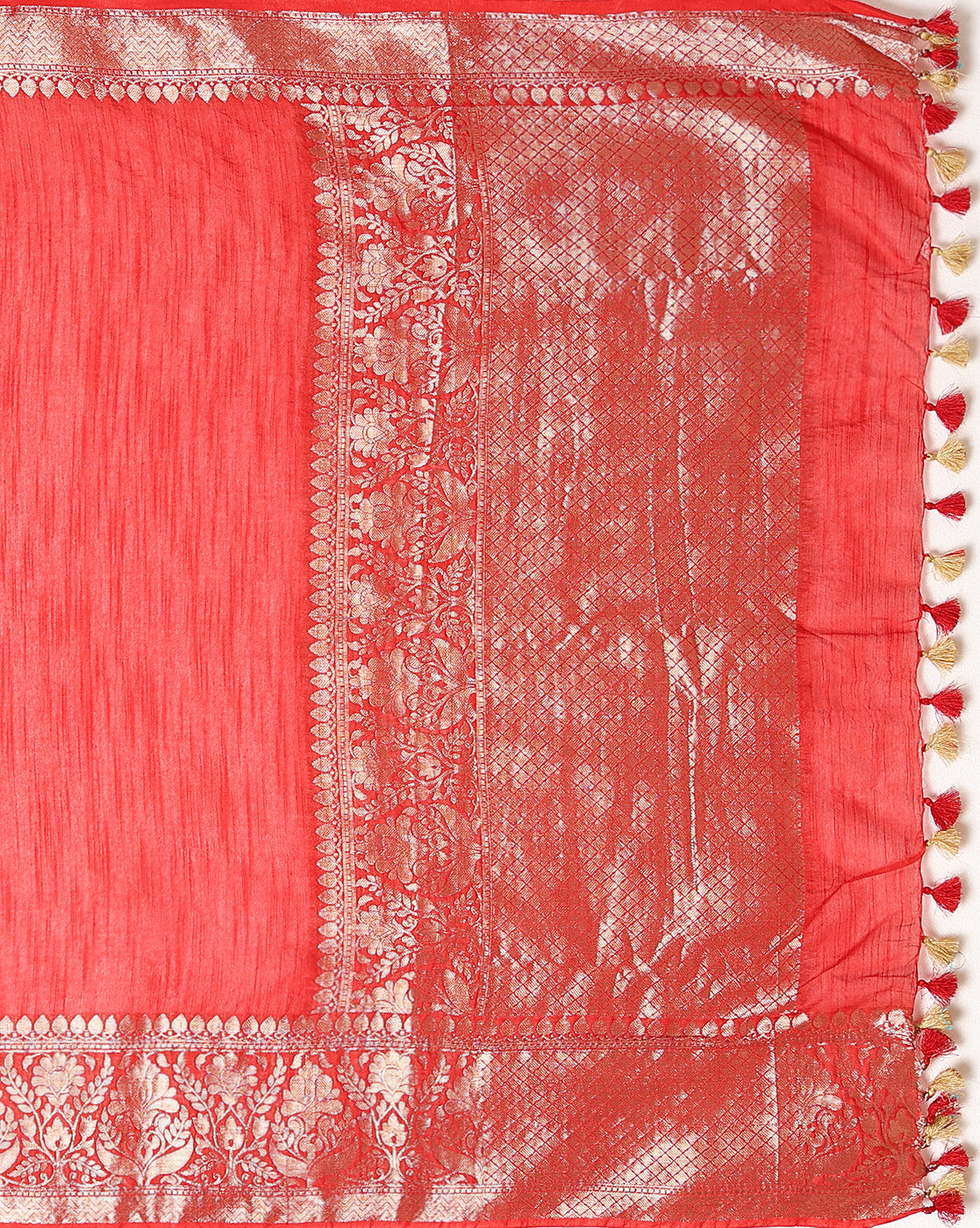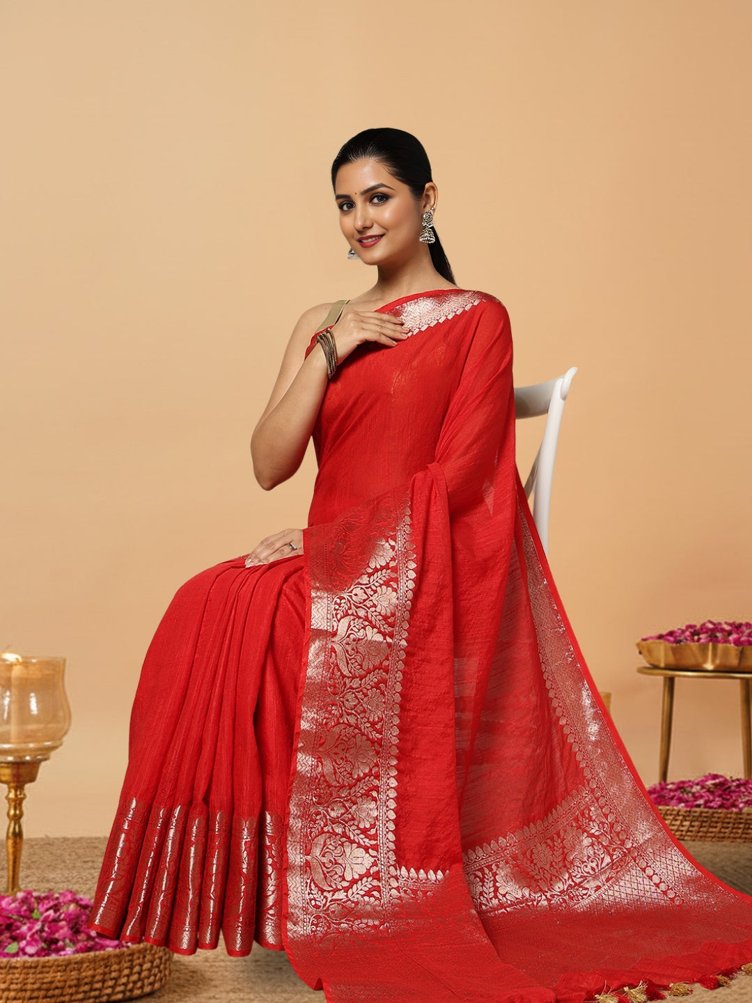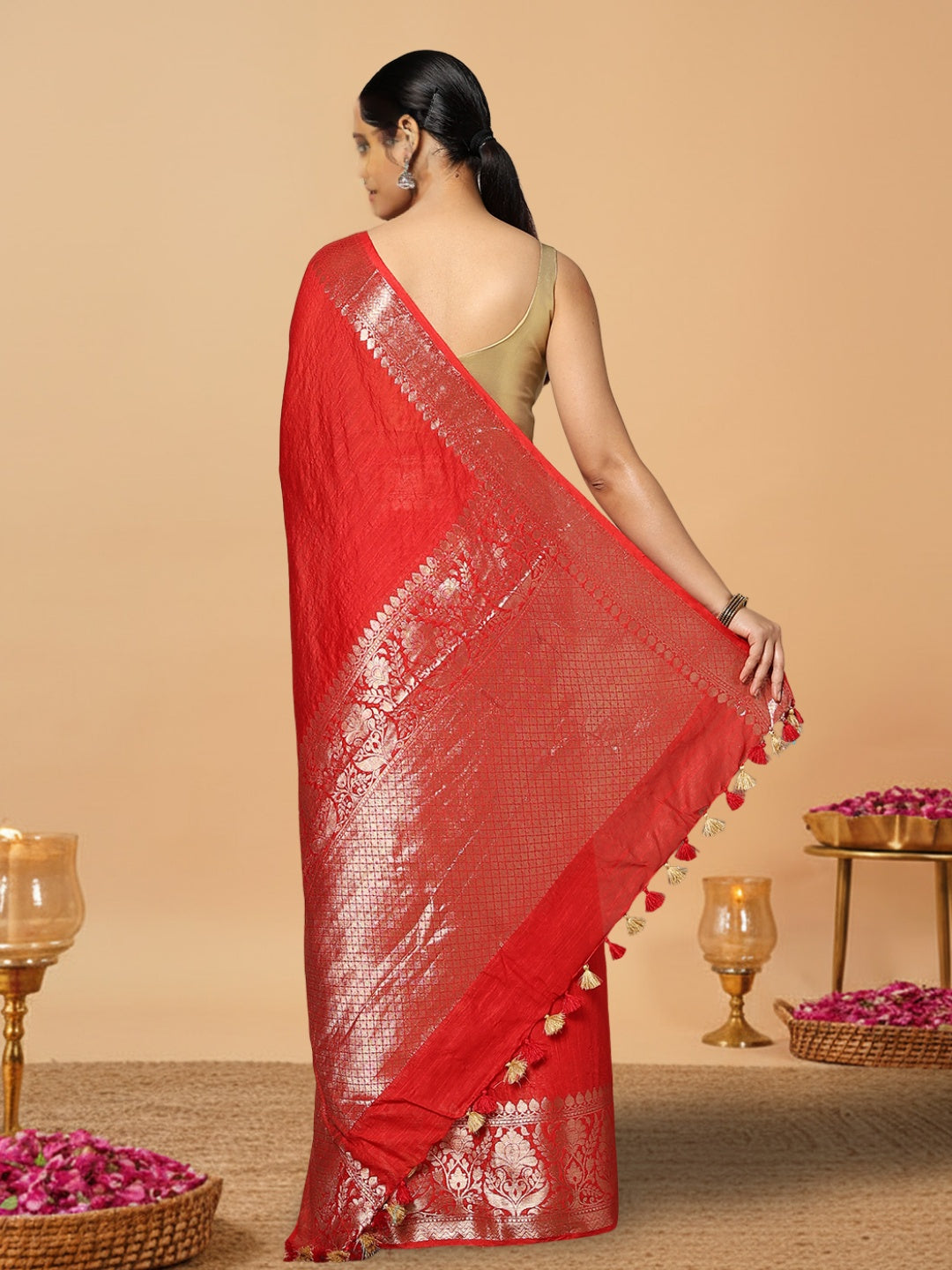 Celebrate timeless elegance with our Handcrafted Banarasi Silk Pure Linen Saree. Meticulously woven with pure silk and linen fibers, each saree boasts intricate Banarasi motifs and luxurious textures, making it a classic choice for special occasions.
