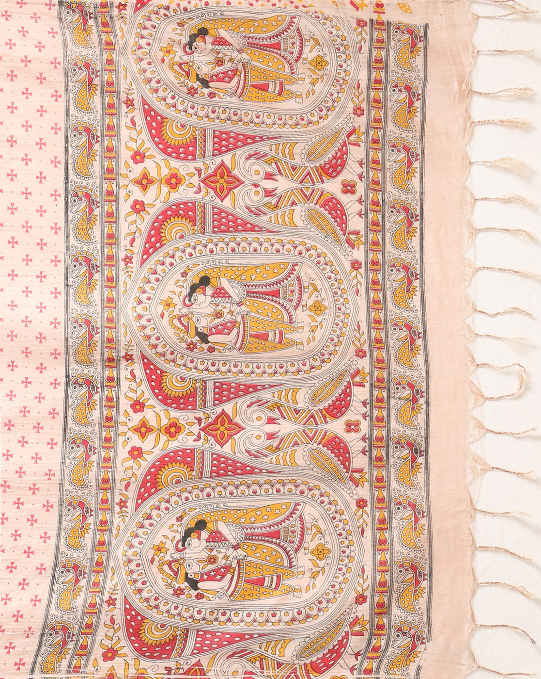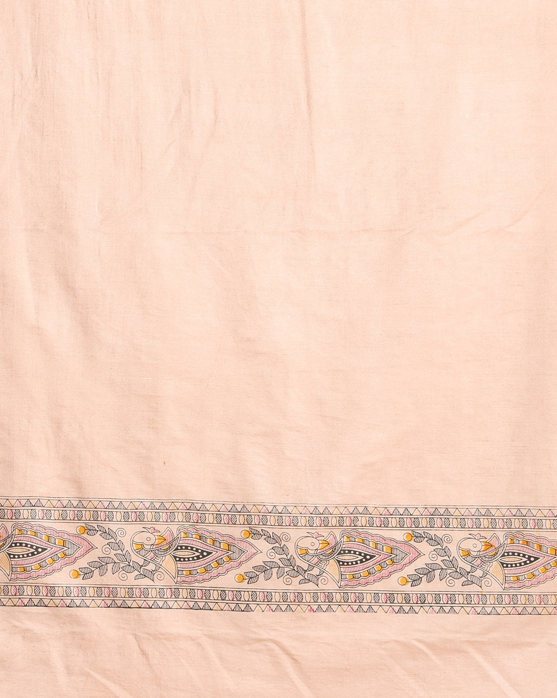 Madhubani handblock print combines the intricate motifs of Madhubani art with the traditional block printing technique. Artisans carve wooden blocks with Madhubani-inspired designs, which are then used to print patterns onto fabric. This process results in vibrant and detailed textiles, often depicting scenes from nature, mythology, or everyday life, with a unique cultural charm.