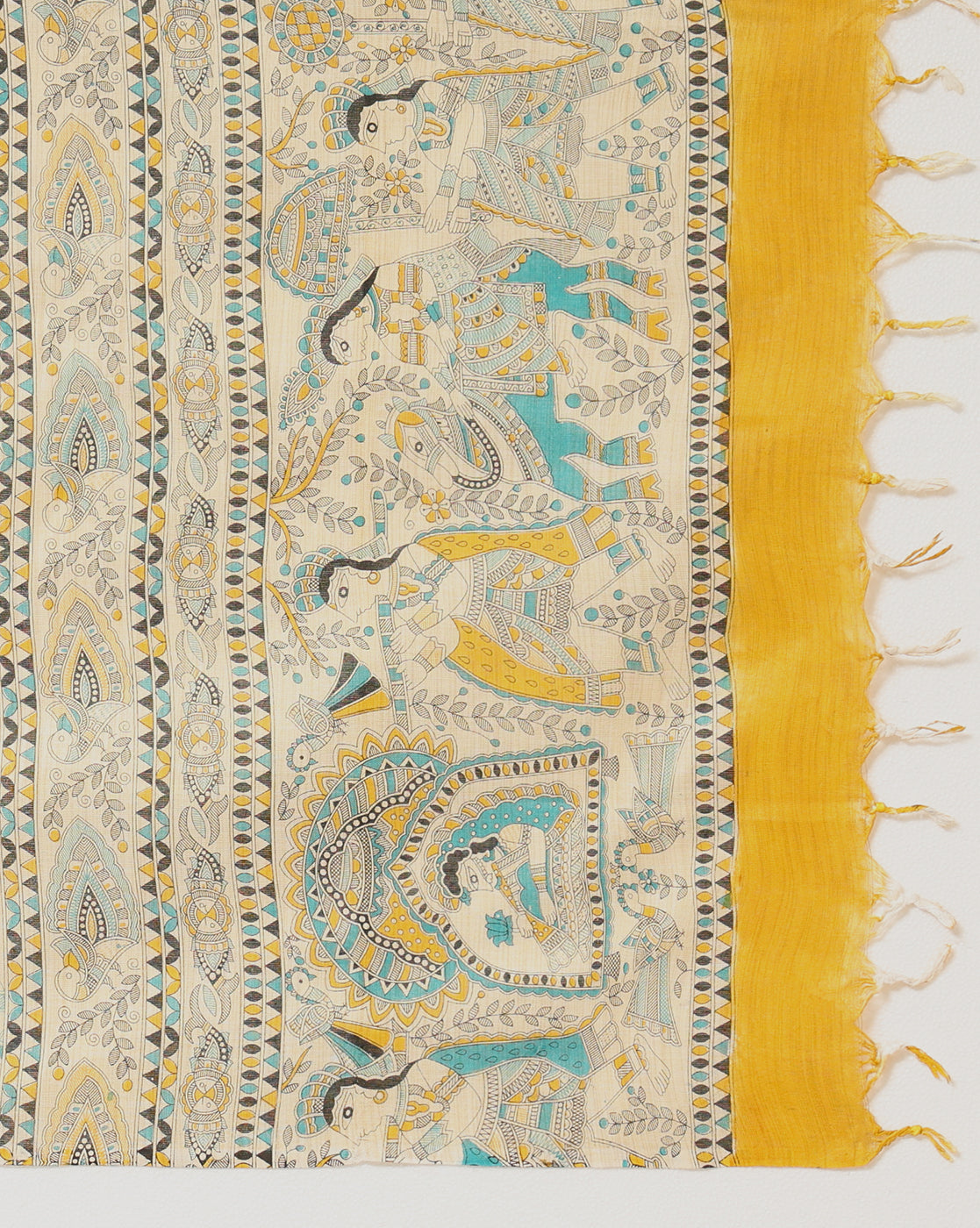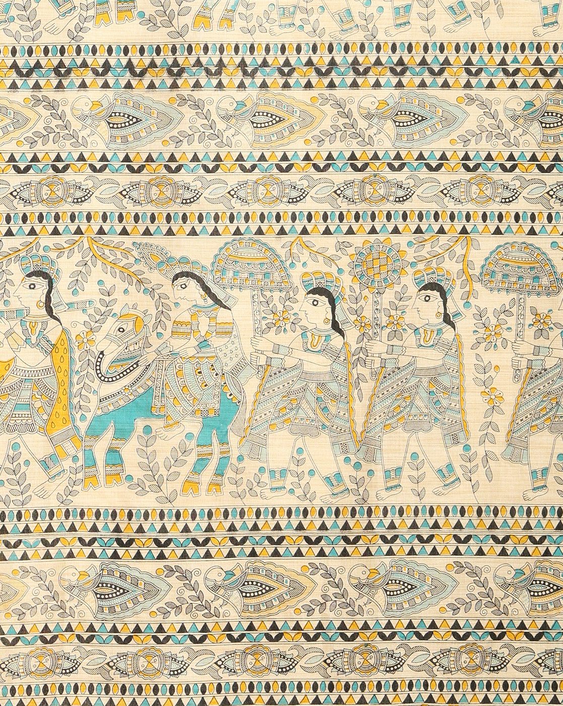 Madhubani handblock print combines the intricate motifs of Madhubani art with the traditional block printing technique. Artisans carve wooden blocks with Madhubani-inspired designs, which are then used to print patterns onto fabric. This process results in vibrant and detailed textiles, often depicting scenes from nature, mythology, or everyday life, with a unique cultural charm.