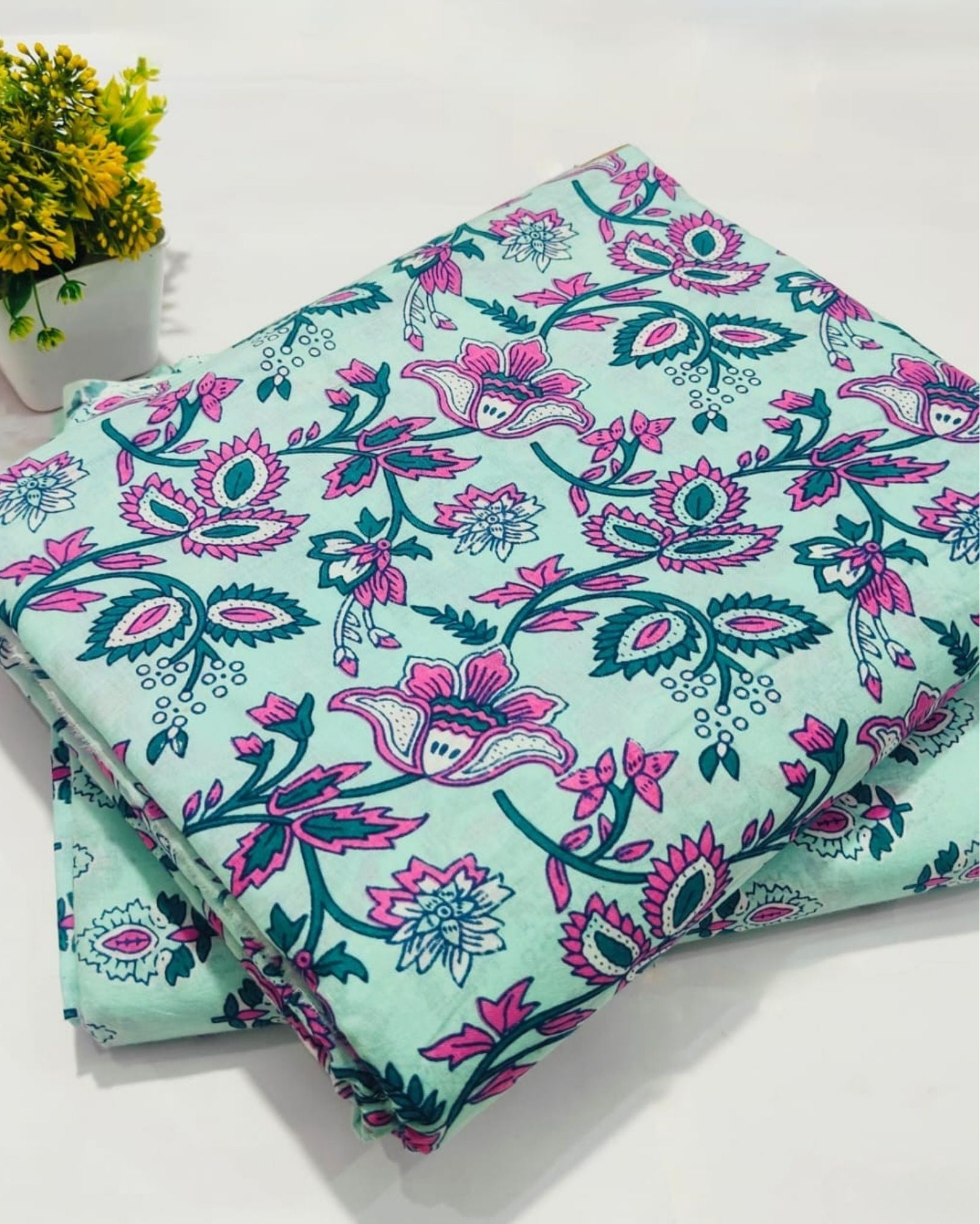Adorn yourself in pure cotton handblock printed elegance: a top and bottom ensemble that blends intricate designs with serene comfort, perfect for celebrating special moments with grace and tradition.
