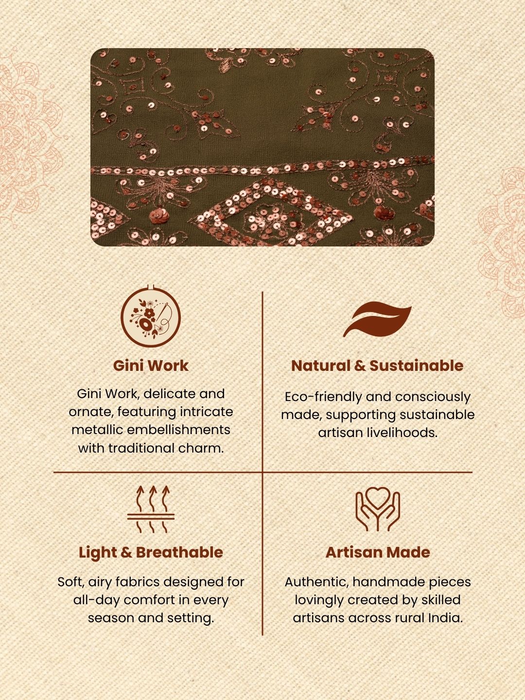 **Sequin Work** is a decorative technique where small reflective sequins are stitched onto fabric to create shine and texture. You get light-catching detail that enhances festive and occasion wear while adding depth and visual interest to the design.