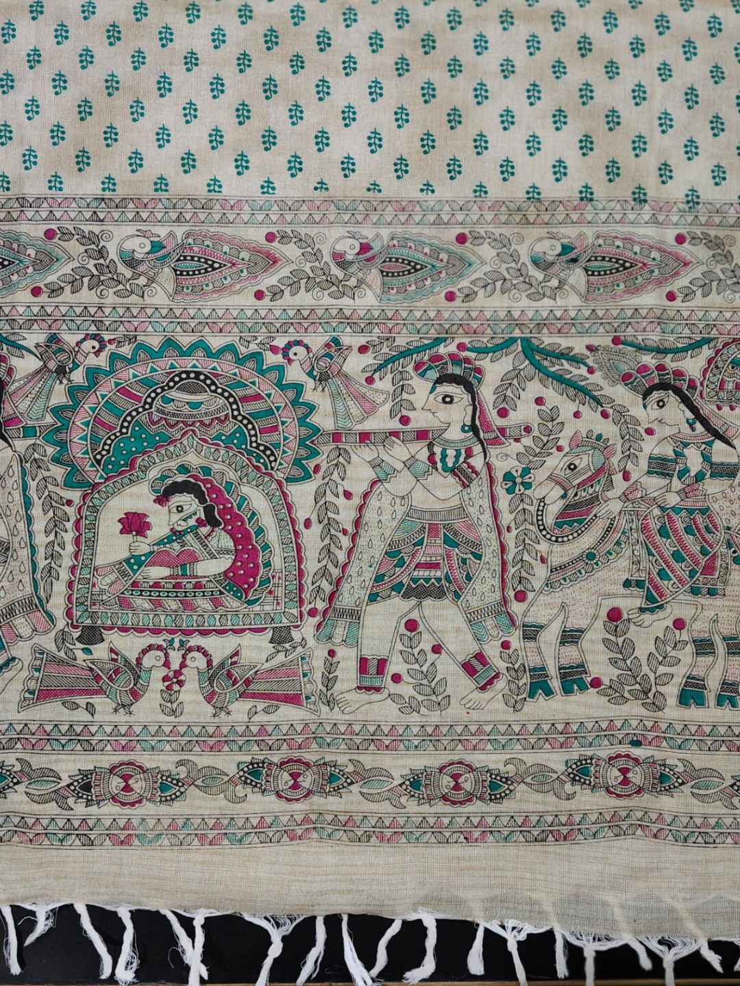 -The fabric is then hand block printed or screen printed with Madhubaniinspired motifs.