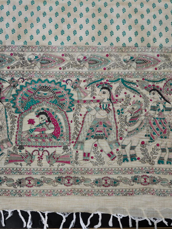 Chic Madhubani Khadi Cotton Suit Beige & Teal Green