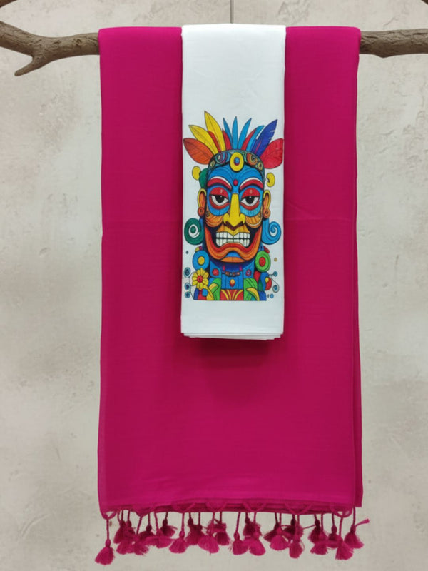 A Pure Handloom Khadi Cotton Saree with handpainted blouse is a timeless piece crafted from handspun and handwoven khadi cotton. The saree features the natural charm of handloom weaving, paired with a beautifully handpainted blouse — each brushstroke reflecting the artist’s creativity and precision. This makes every ensemble unique and one-of-a-kind.