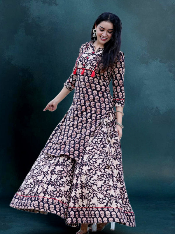 GulRaag Blockprinted Long Kurta & Skirt Chic Black