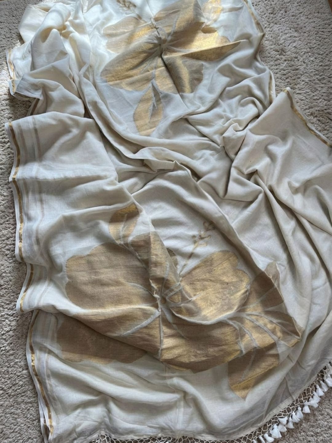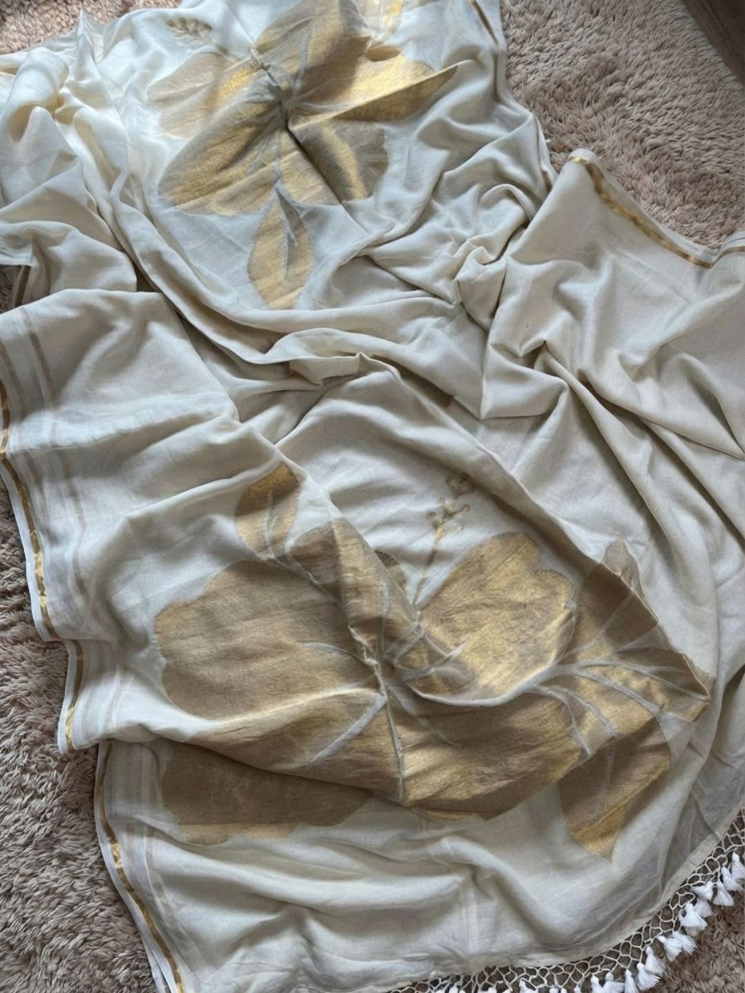 Pure mul cotton handloom saree featuring detailed hand-printed motifs. Soft, airy, and lightweight, perfect for festive occasions, casual outings, or everyday wear with handcrafted elegance.