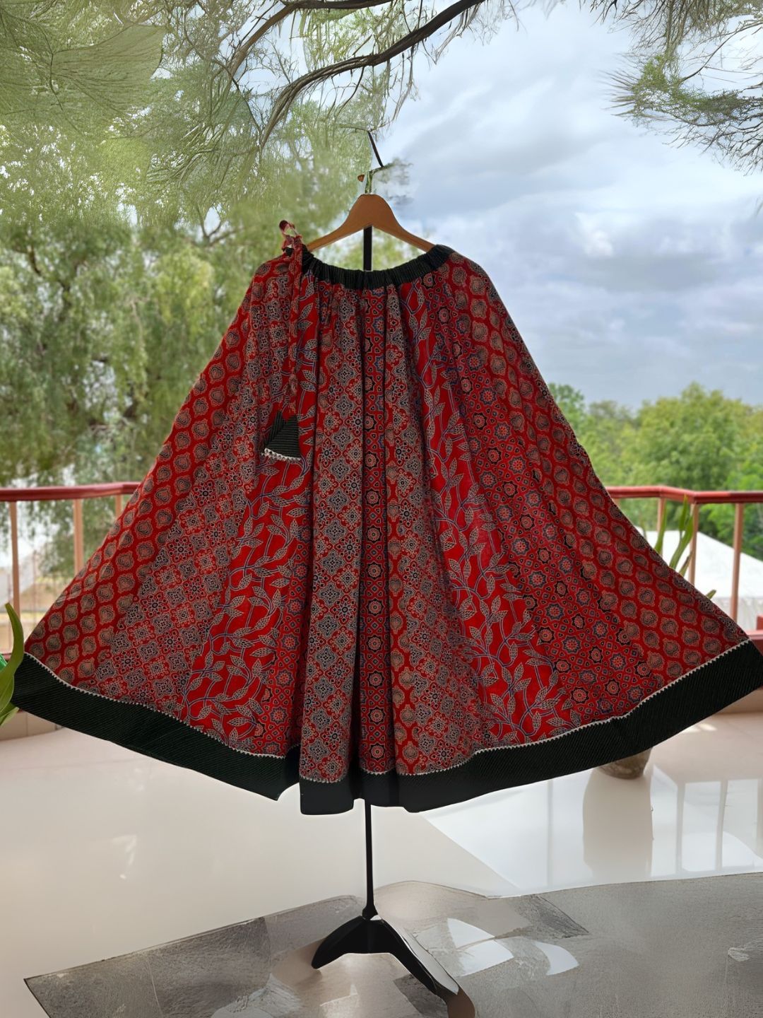 Ajrakh Blockprint Cotton Lehanga Skirt, handcrafted with natural dyes and intricate traditional patterns. This lightweight, flowy skirt offers timeless elegance, perfect for festive occasions, ethnic gatherings, or effortless everyday bohemian style.