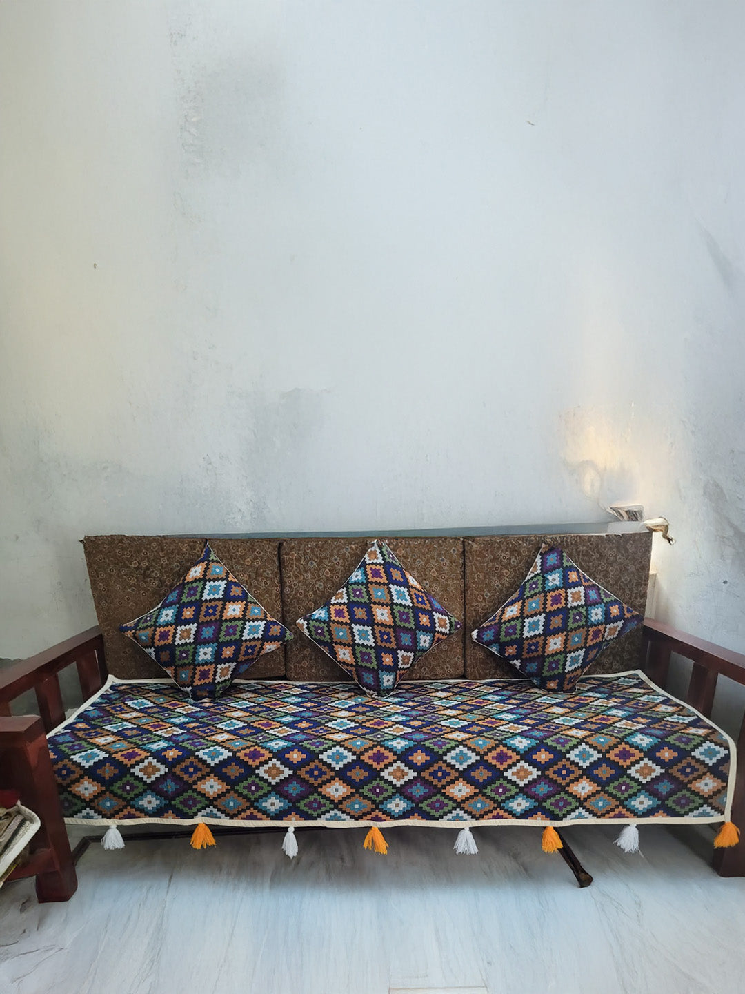 Cotton sofa throw with matching cushion cover crafted in handloom jacquard weaving. Soft, durable, and stylish, perfect for enhancing living spaces with texture, comfort, and traditional woven appeal.