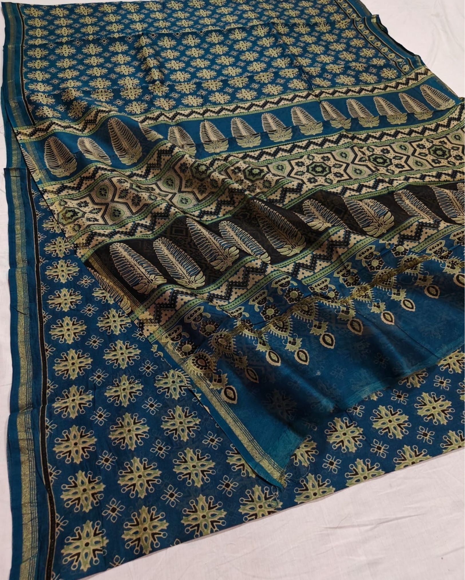 Elegant Chanderi Silk Saree featuring traditional Ajrakh Printing. Lightweight, breathable, and perfect for festive occasions or cultural events. A timeless blend of heritage craftsmanship and contemporary charm for your wardrobe.