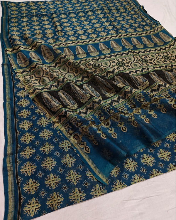 Goonj Chanderi Silk Fresh Blue Ajrakh Printed Saree