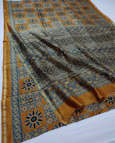 Elegant Chanderi Silk Saree featuring traditional Ajrakh Printing. Lightweight, breathable, and perfect for festive occasions or cultural events. A timeless blend of heritage craftsmanship and contemporary charm for your wardrobe.Work:...