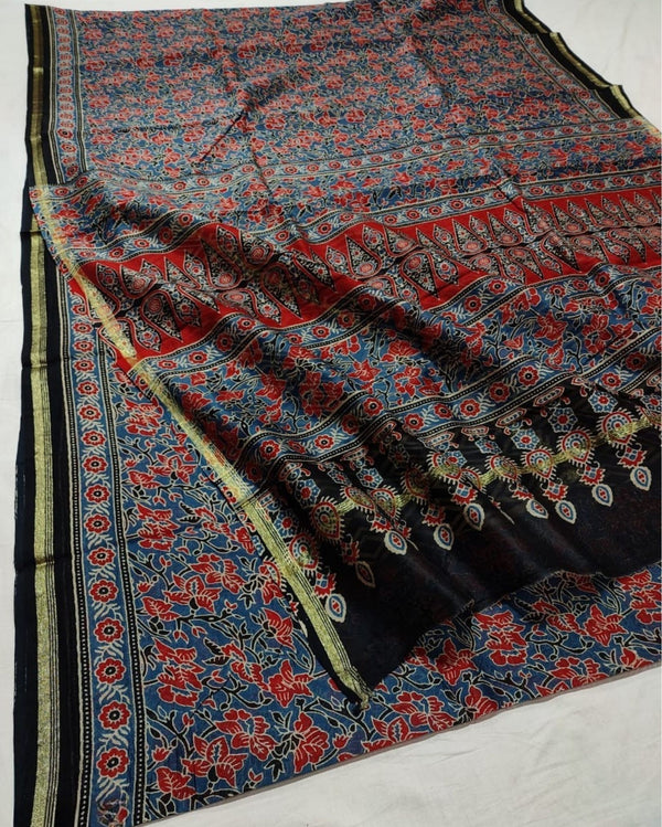 Elegant Chanderi Silk Saree featuring traditional Ajrakh Printing. Lightweight, breathable, and perfect for festive occasions or cultural events. A timeless blend of heritage craftsmanship and contemporary charm for your wardrobe.