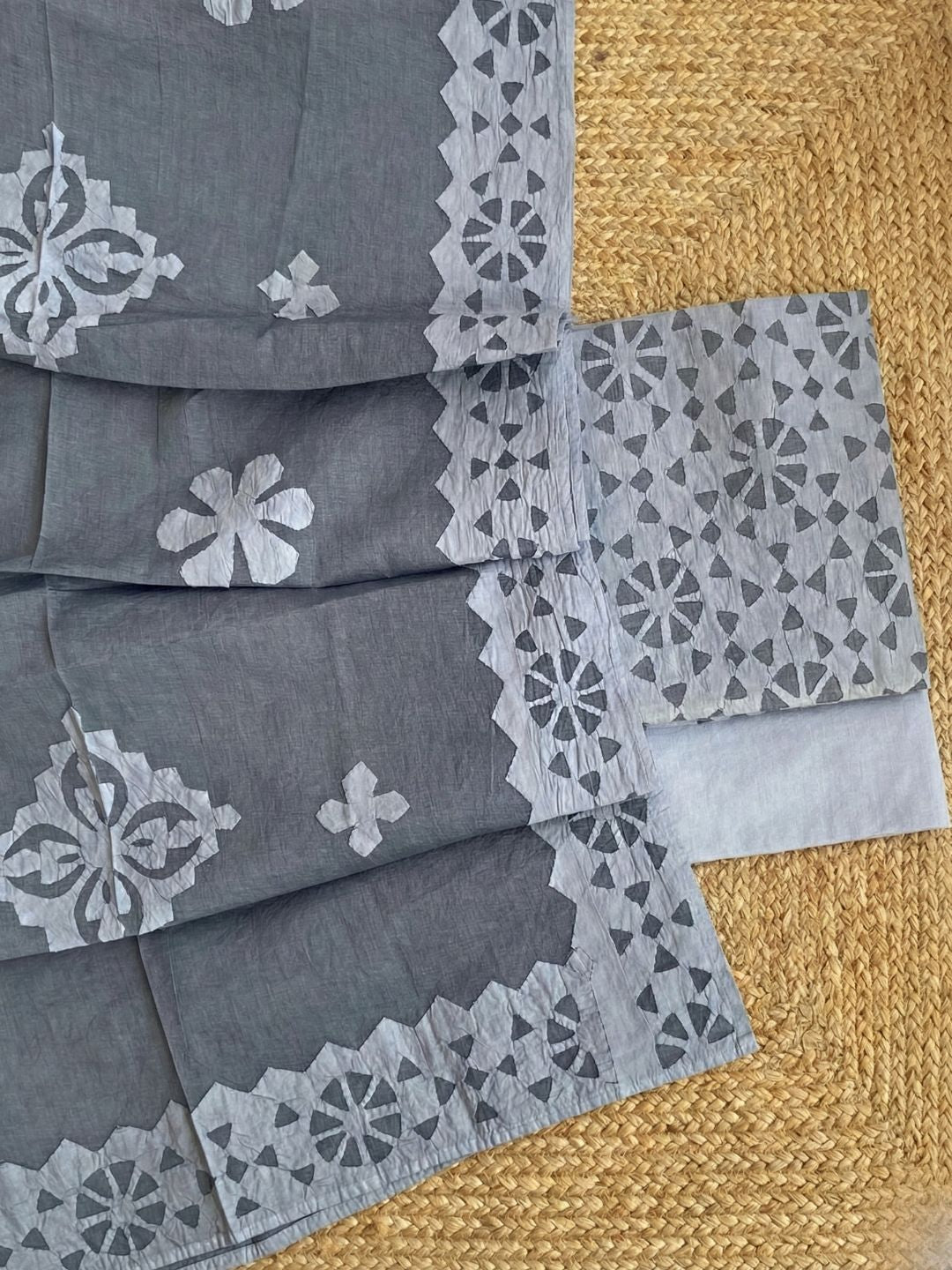 **Appliqué** is a surface technique where fabric motifs are cut, layered, and stitched onto a base fabric to create bold patterns, texture, and visual contrast, often seen in traditional and craft-led textiles.