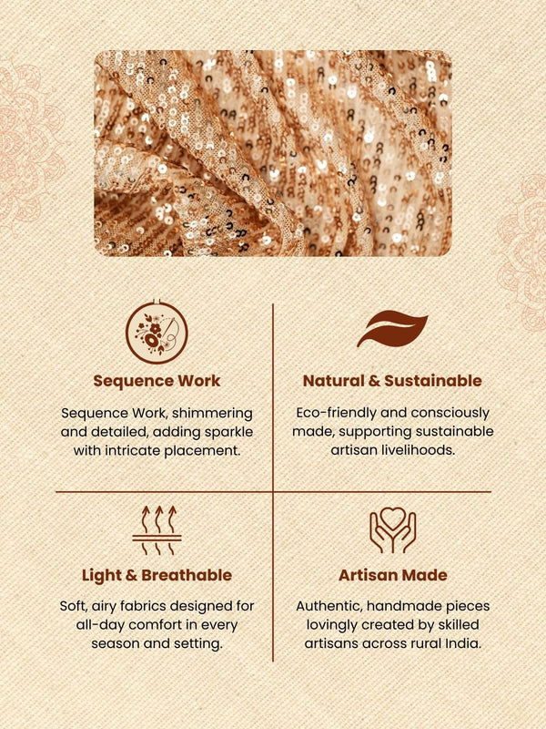 **Sequin Work** is a decorative technique where small, shiny discs called sequins are stitched onto fabric to create sparkle and texture. Applied by hand or machine, this work enhances sarees, lehengas, dupattas, and gowns with a bright, festive, and eye-catching finish suitable for celebrations and special occasions.