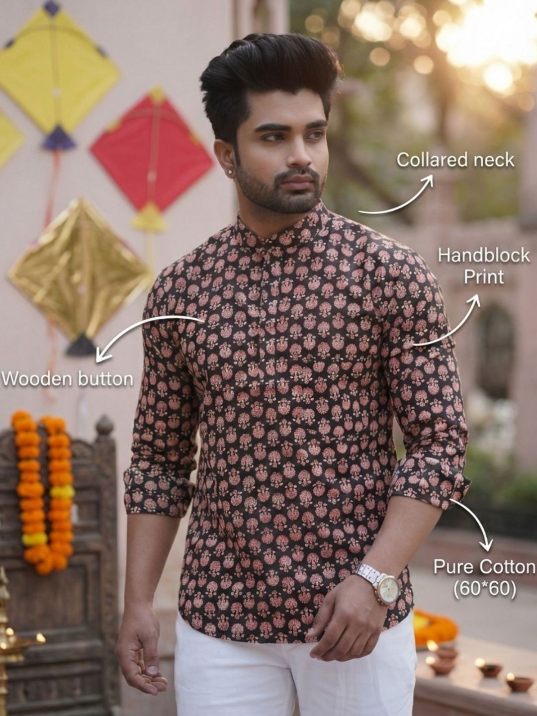 Pure cotton (60×60) short kurta featuring traditional handblock prints. Soft, breathable, and comfortable, ideal for daily wear, casual outings, or relaxed festive moments with ethnic simplicity.