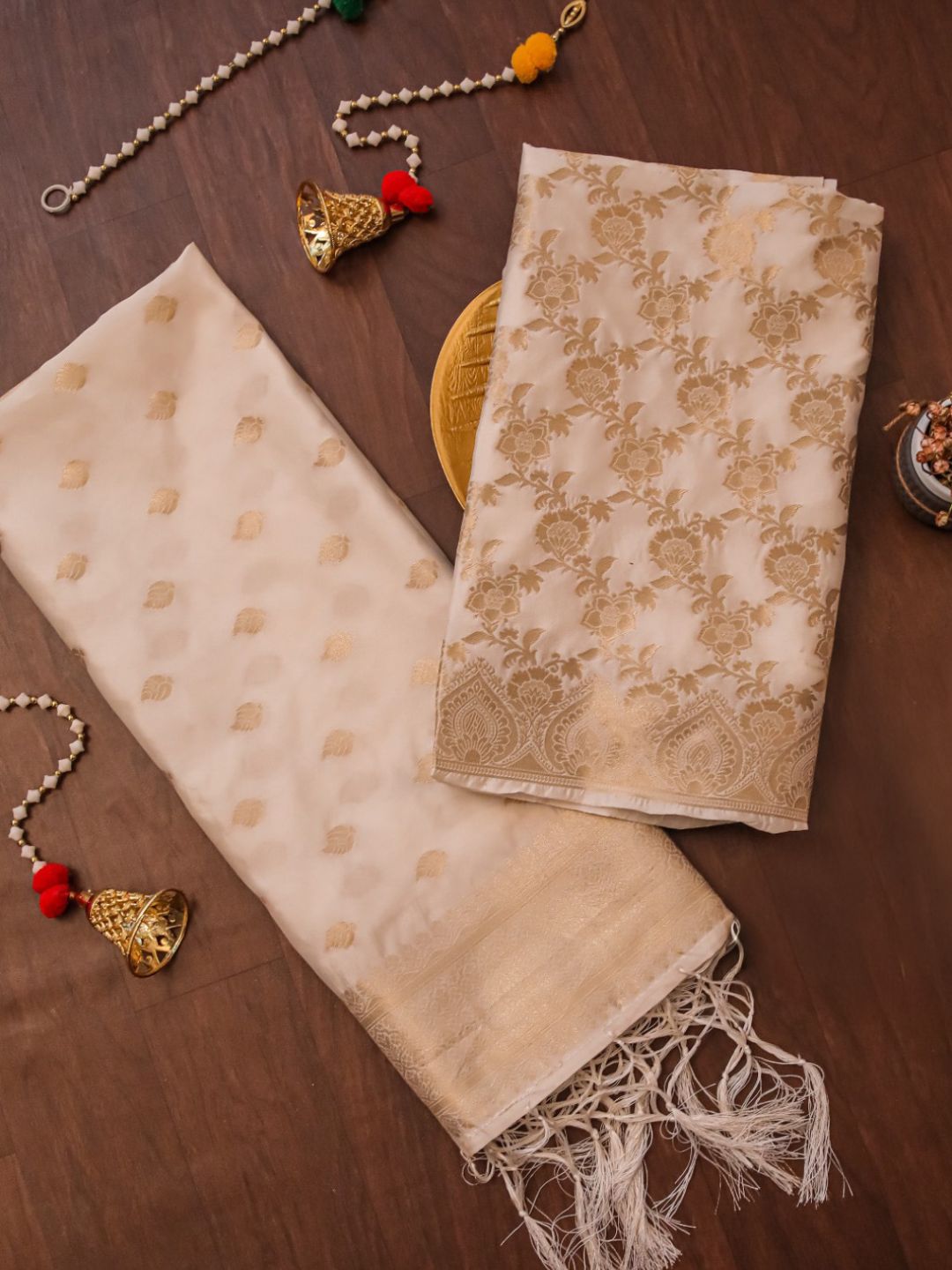 -Supplementary weft threads in zari (gold or silver) are inserted to create elaborate motifs.
